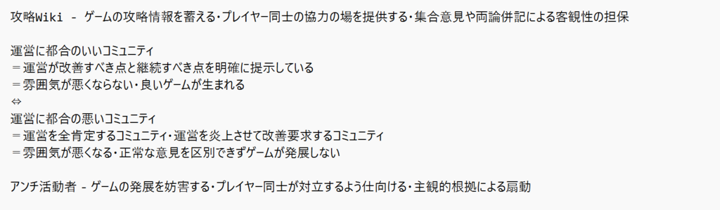 画像の図の通り、攻略Wikiのコメント欄のようなプレイヤーコミュニティはプレイヤーの手でゲームを発展させていく上で、大きな役割を果たせると考えています。しかし、このようなコミュニティから健全な環境が失われると、逆にアンチの恰好の的になり、ゲームが悪くなる負のスパイラルに陥ります。
