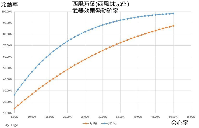 雑翻訳ですまんが西風万葉の元素スキルで粒子出る確率のグラフ、HIT数が多いから25%↓程度の会心率でも粒子出る確率は見た目より高い。CT毎に爆発撃つ場合は更に上がる。