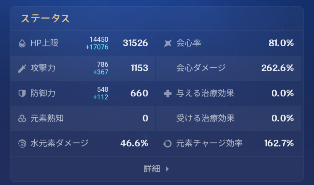 長くなりそうだから画像付きで。自分は武器若水でメインOPはHP%時計/水バフ盃/会心ダメ冠で運用していてチャージは160ちょっと。敵の数にもよるけど1凸してるから2回分粒子回収できてギリギリ回るくらい。激戦だともうちょいチャージ欲しくなる(ただし一度ローテ回ってしまえばある程度ちゃんと爆発打てるから盛りすぎず疎かにしすぎずで180〜200弱くらい)