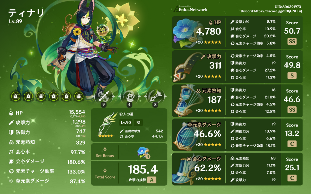武器に会心があるかどうかで大分変ってくるから武器によって要求ステが変わる。ティナリは突破ステに会心もないから、会心が無い武器でよく見る60/120にしようとするとスコアにして120近く要求される。これは毎日石割り一回で聖遺物秘境五回やってリサイクルに回してを繰り返し1か月以上かかってもおかしくはないスコアなので目標数値だけ決めても苦しみが増えがち。