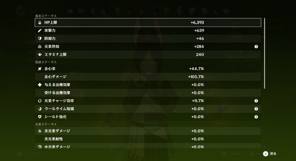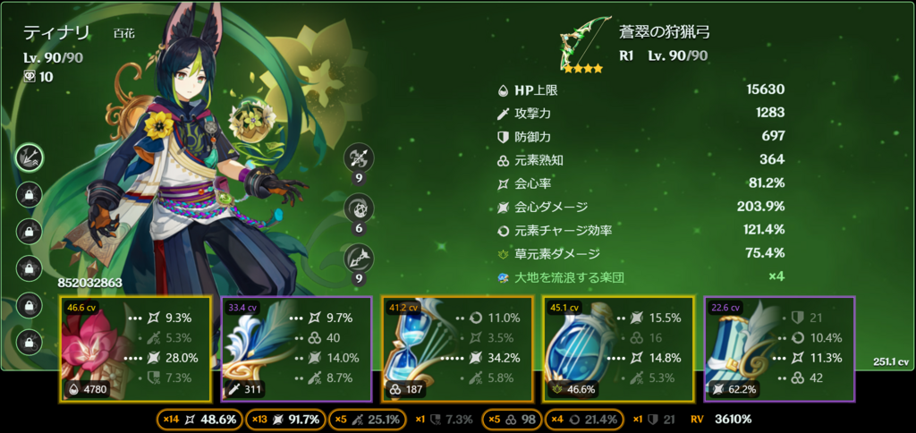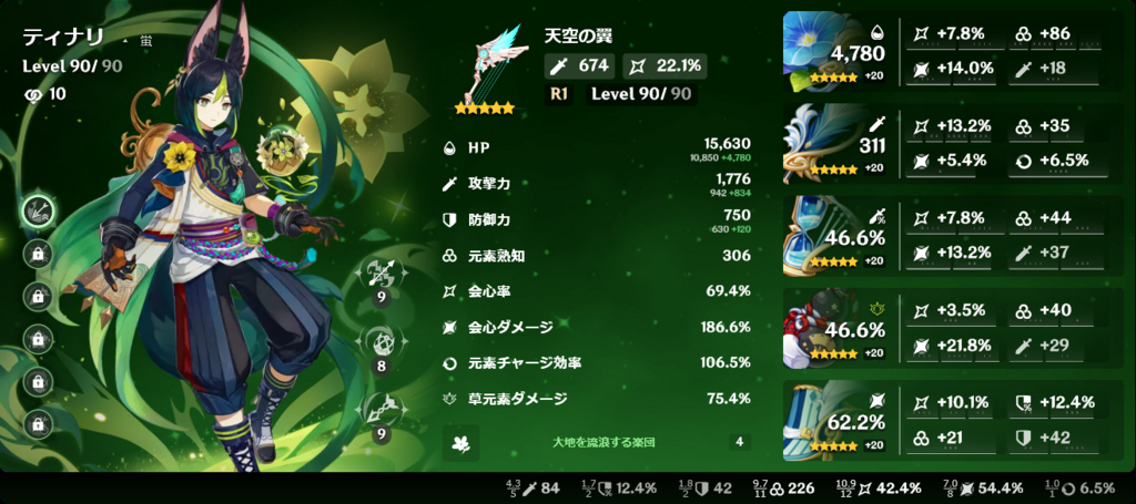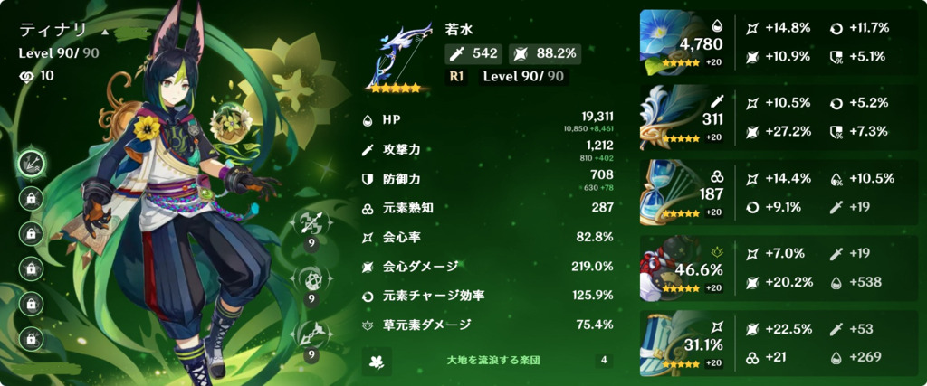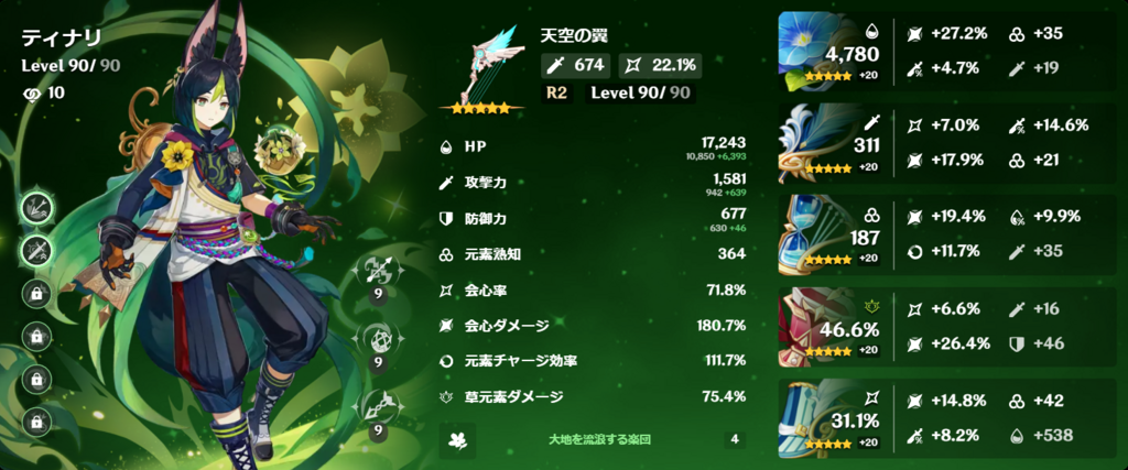 1枝から大物が登場してるのでちょっと霞んじゃうけど、恒常オンリーの弊ワットではトップダメージディーラーのティナリ。聖遺物だけの会心スコア200は超えたいー。