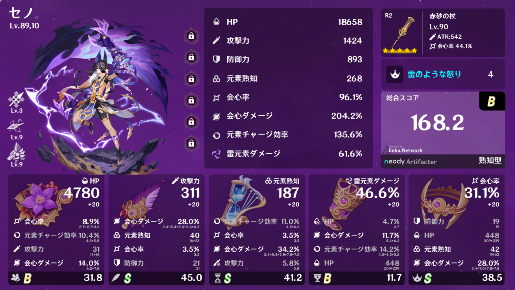 有難うございます、ジンが既に西風運用してるので、ついでに草主人公も西風持たせてセノの150%目安で雷のような怒り掘りながら試してみます。
