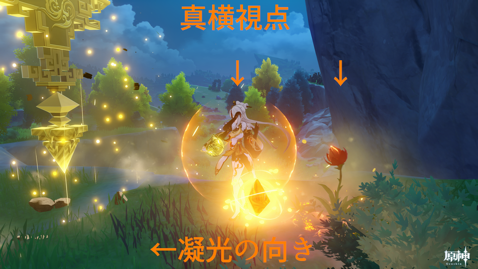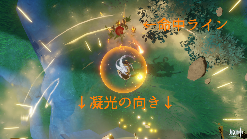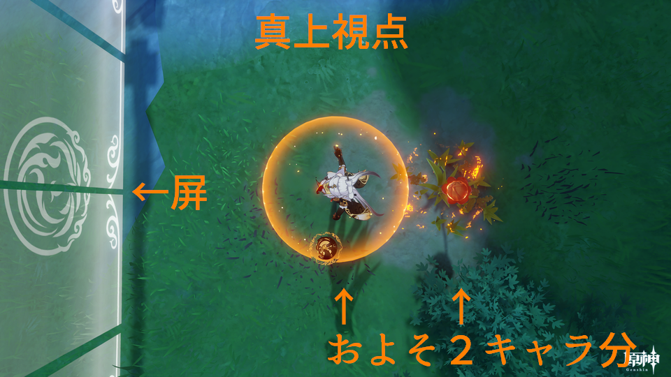 ショウリの元素爆発と同じ感覚(キャラの前方を中心点に円範囲)で良いんだな。範囲自体は先生より狭そうだけど。元素スキルでここまで範囲広いとは思ってなかったな・・・