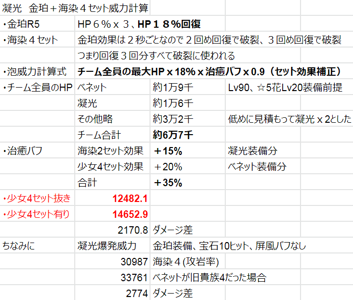 雑シートだけど計算したよ。うちはベネット入りPTに金珀凝光は疑問ですね。普通に流浪とかのほうがええとおもいます。(金珀はヒーラー抜きPTでつかう上で価値があると思っています)ただ、金珀凝光としては海染4自体なかなかの火力ブーストですねこれ。