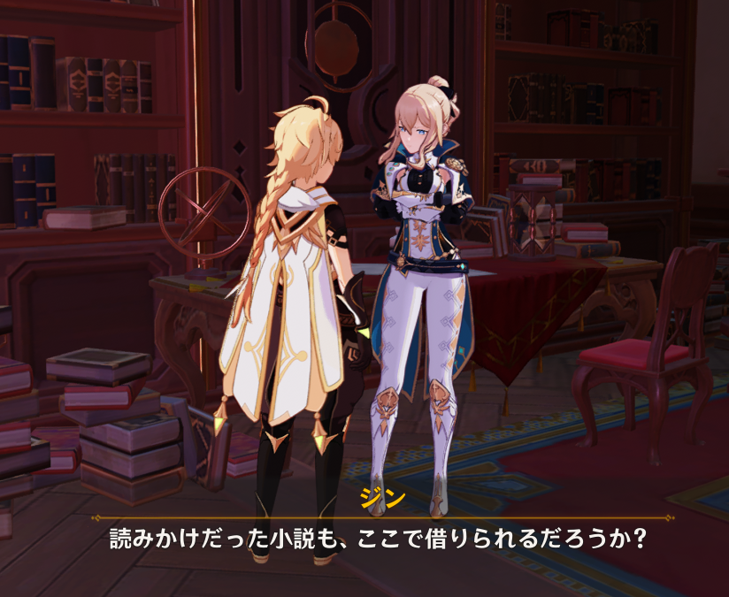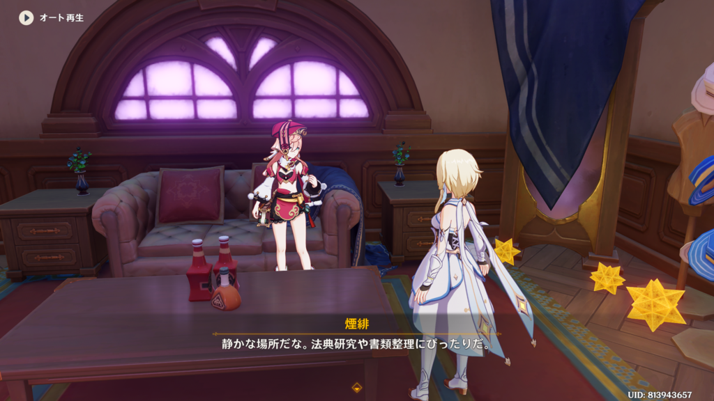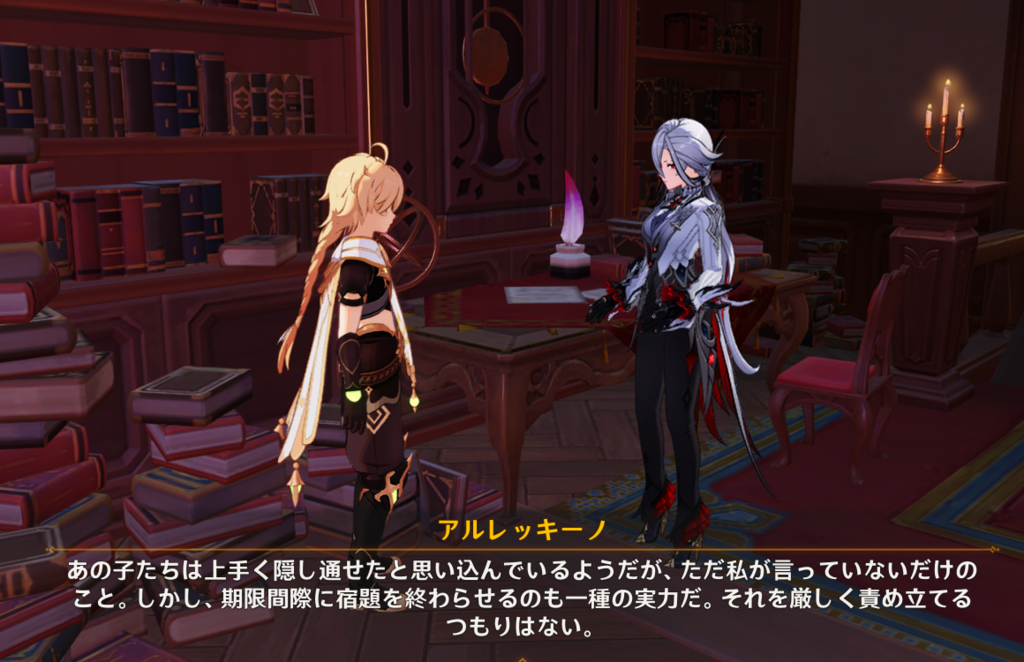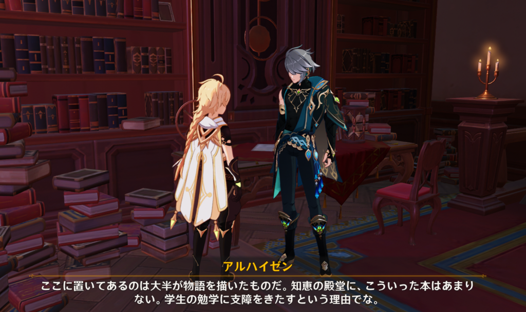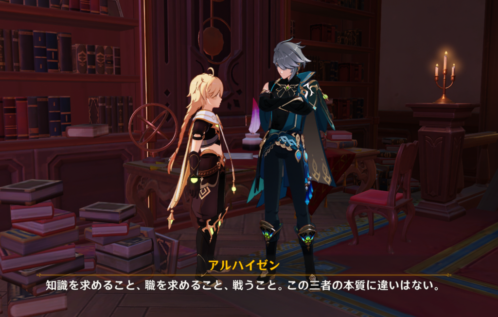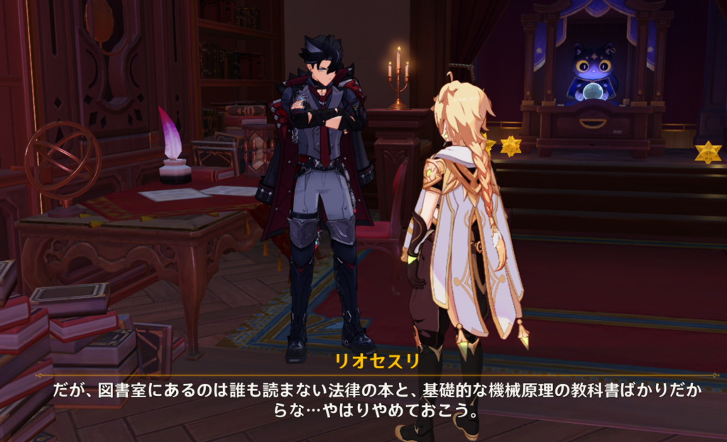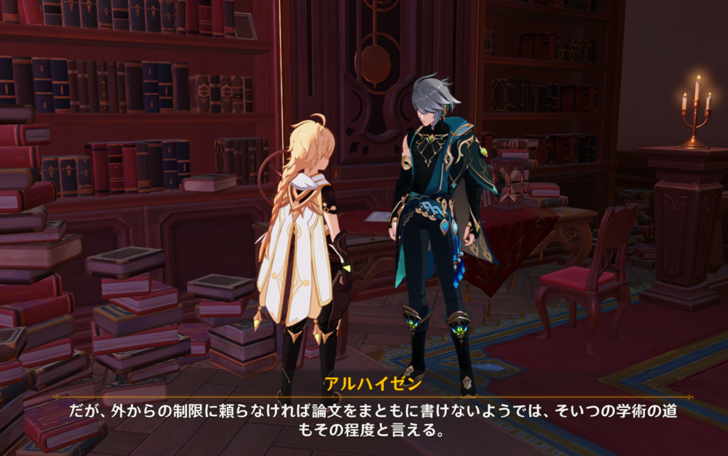 ①静かな場所だな。法典研究や書類整理にぴったりだ。ああ、そういえば、以前話した法とは何かということについて、覚えているか? 忘れたって――? なら、また何回でも言う必要がありそうだな。