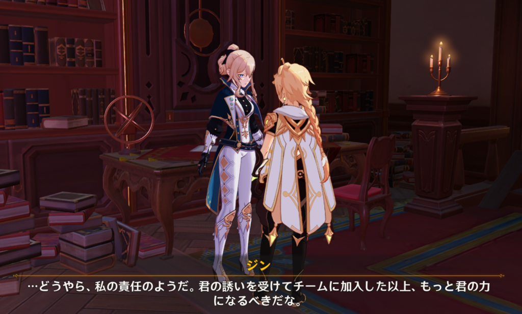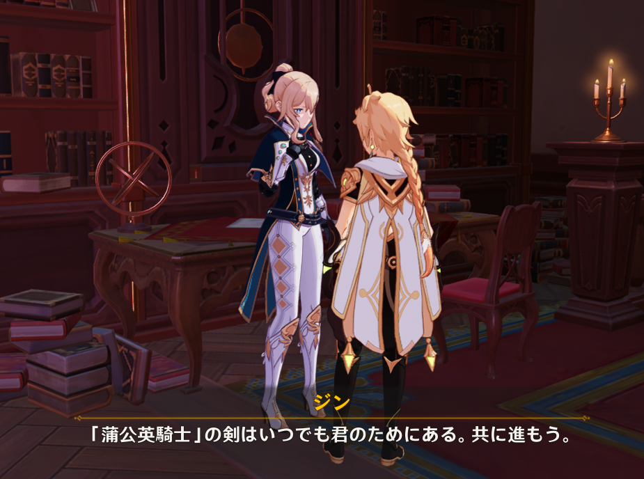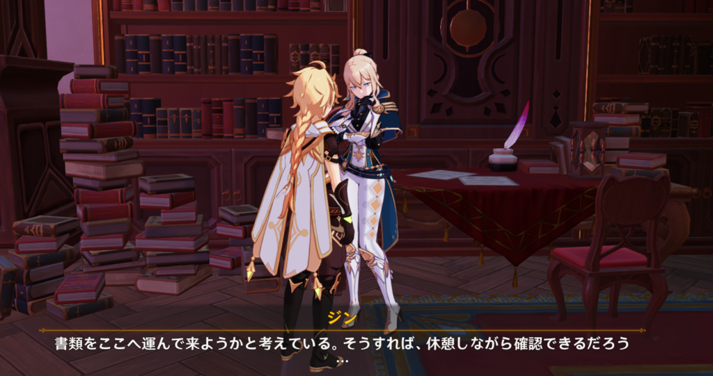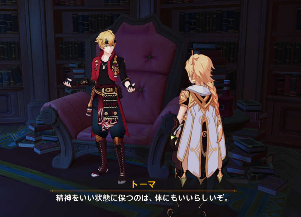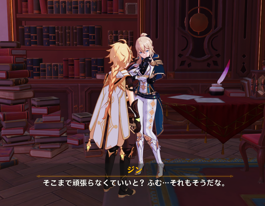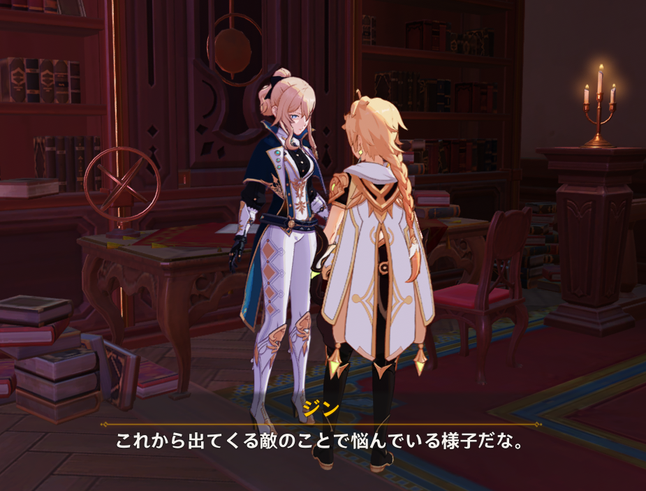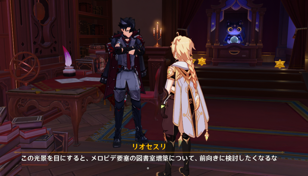 ①静かな場所だな。法典研究や書類整理にぴったりだ。ああ、そういえば、以前話した法とは何かということについて、覚えているか? 忘れたって――? なら、また何回でも言う必要がありそうだな。