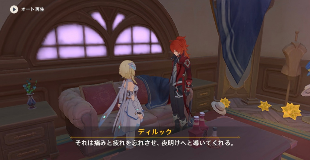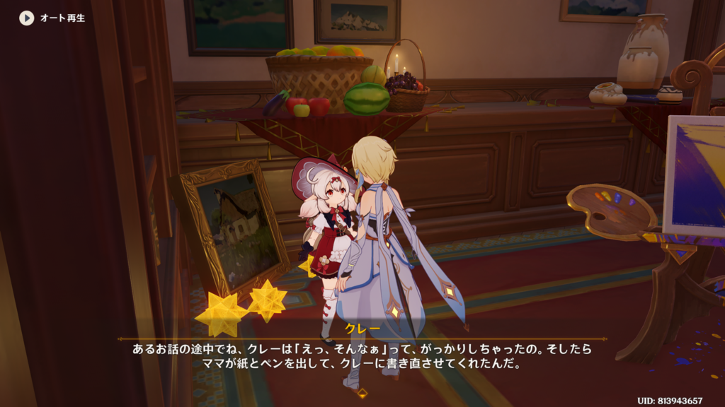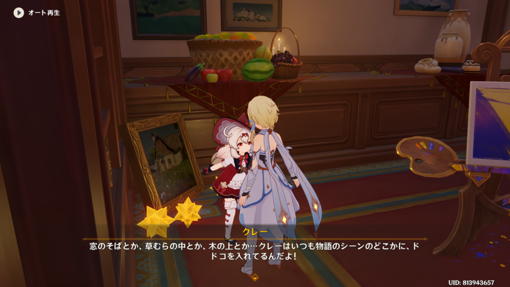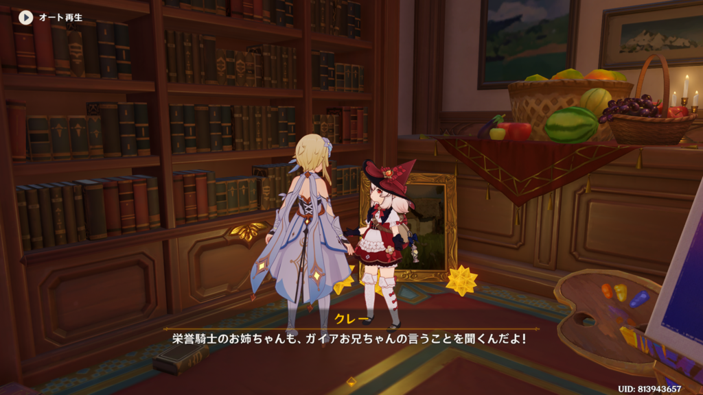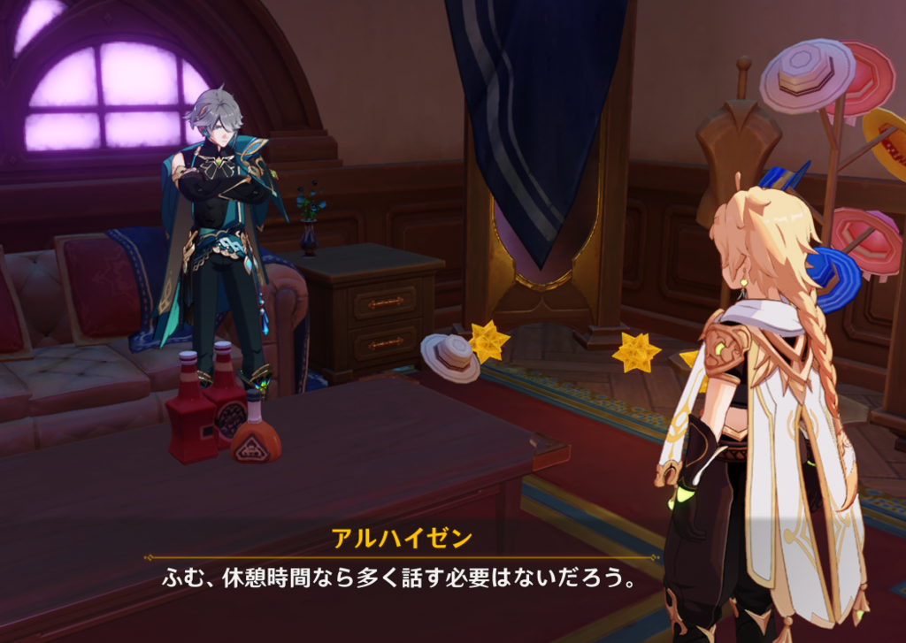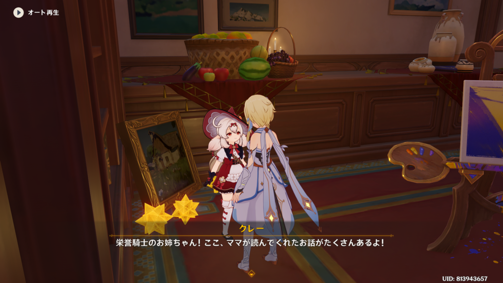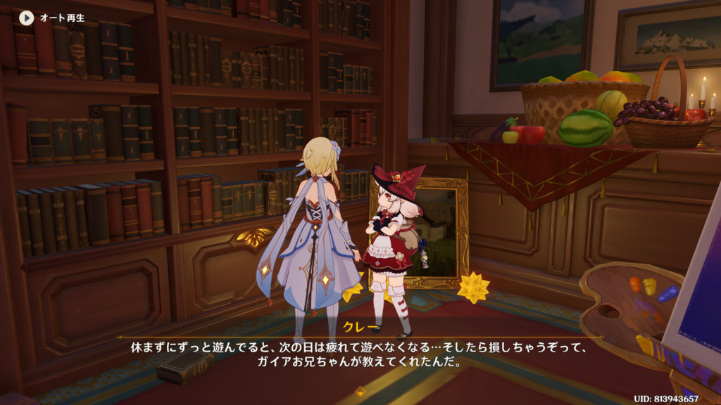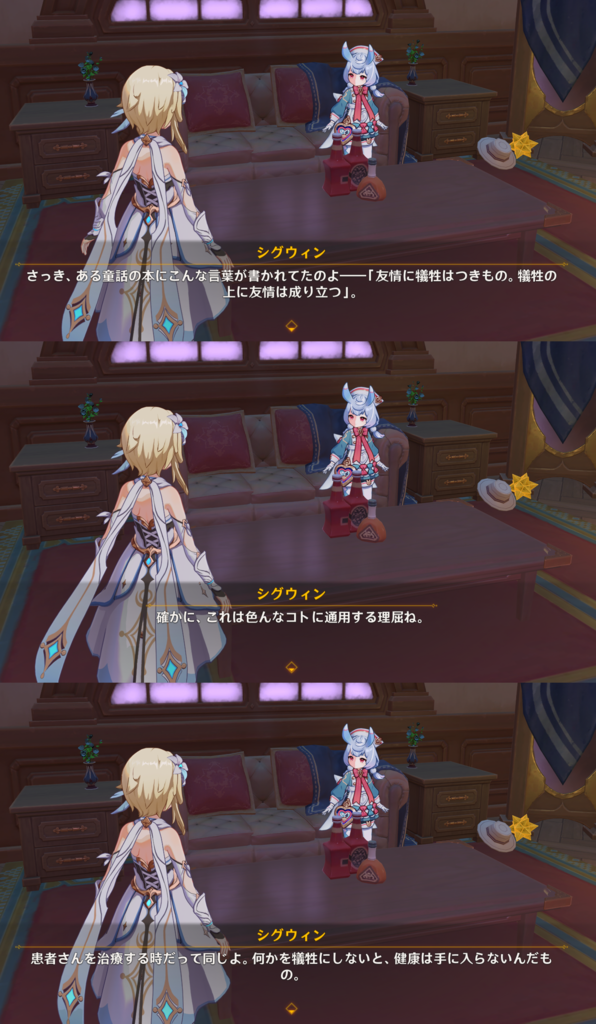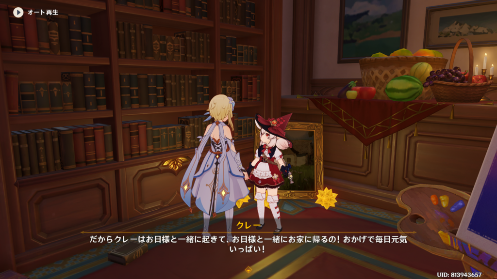 ③休まずにずっと遊んでると、次の日は疲れて遊べなくなる…そしたら損しちゃうぞって、ガイアお兄ちゃんが教えてくれたんだ。だからクレーはお日様と一緒に起きて、お日様と一緒におうちに帰るの! おかげで毎日元気いっぱい! 栄誉騎士のお兄ちゃん/お姉ちゃんも、ガイアお兄ちゃんの言うことを聞くんだよ!