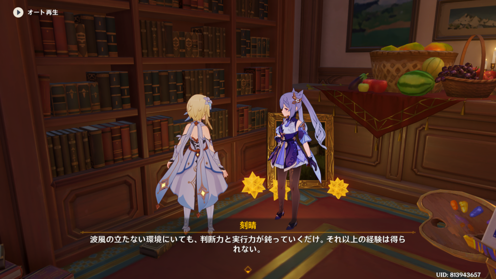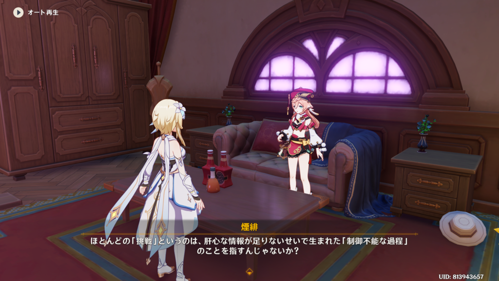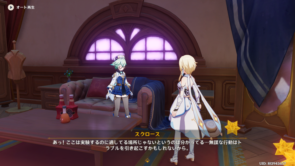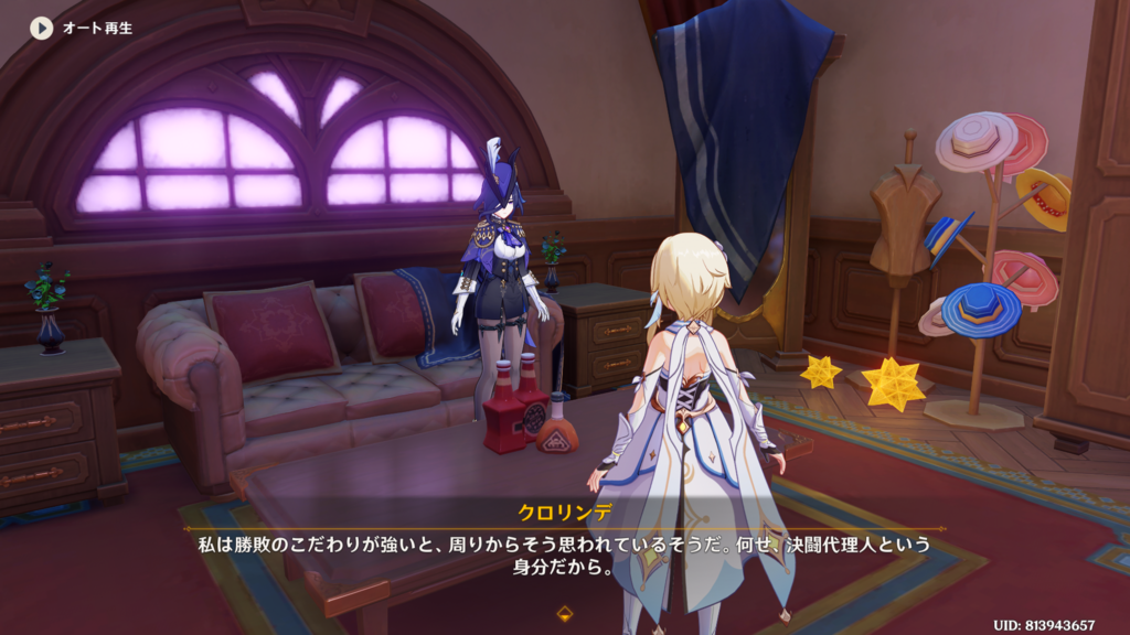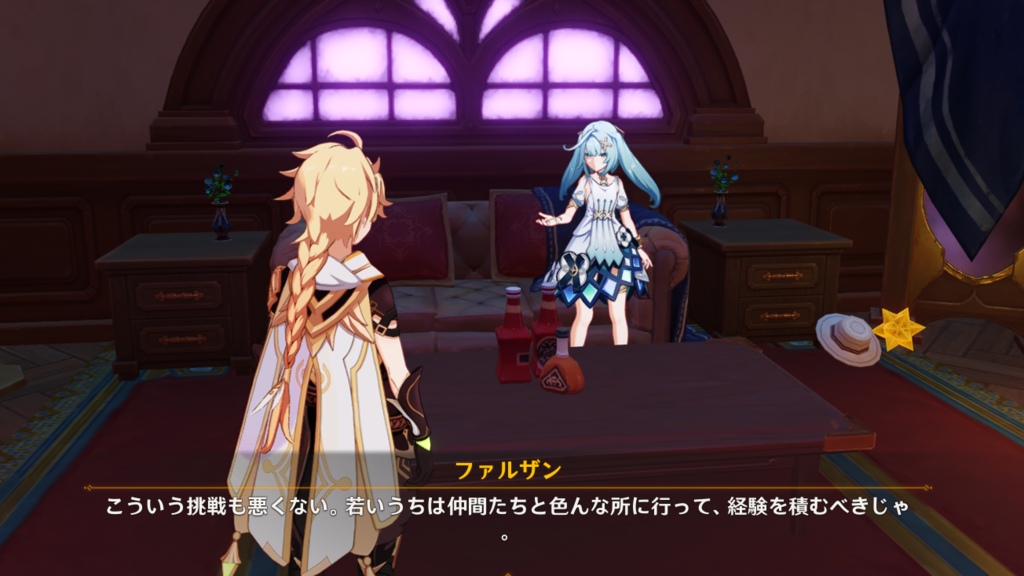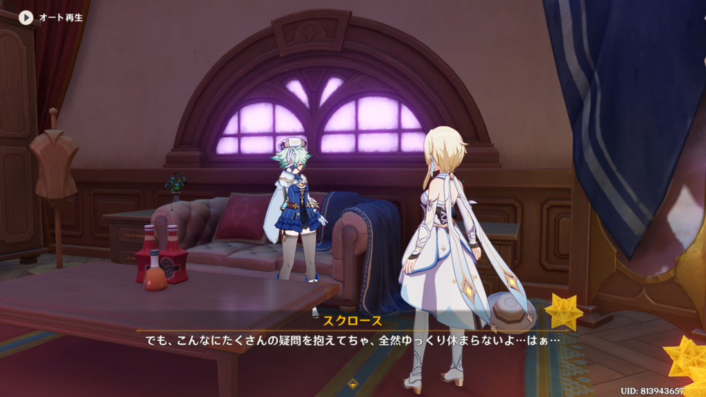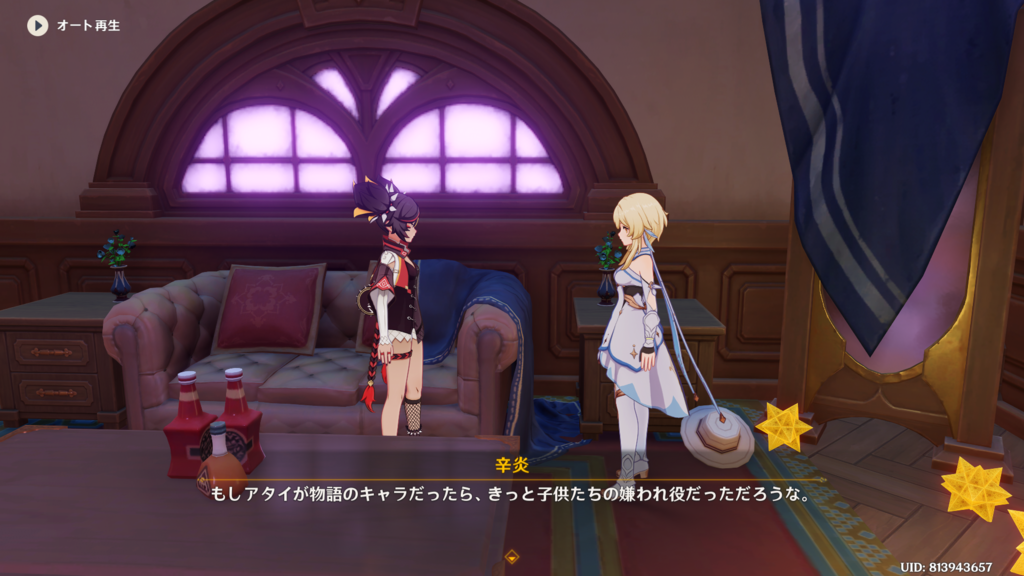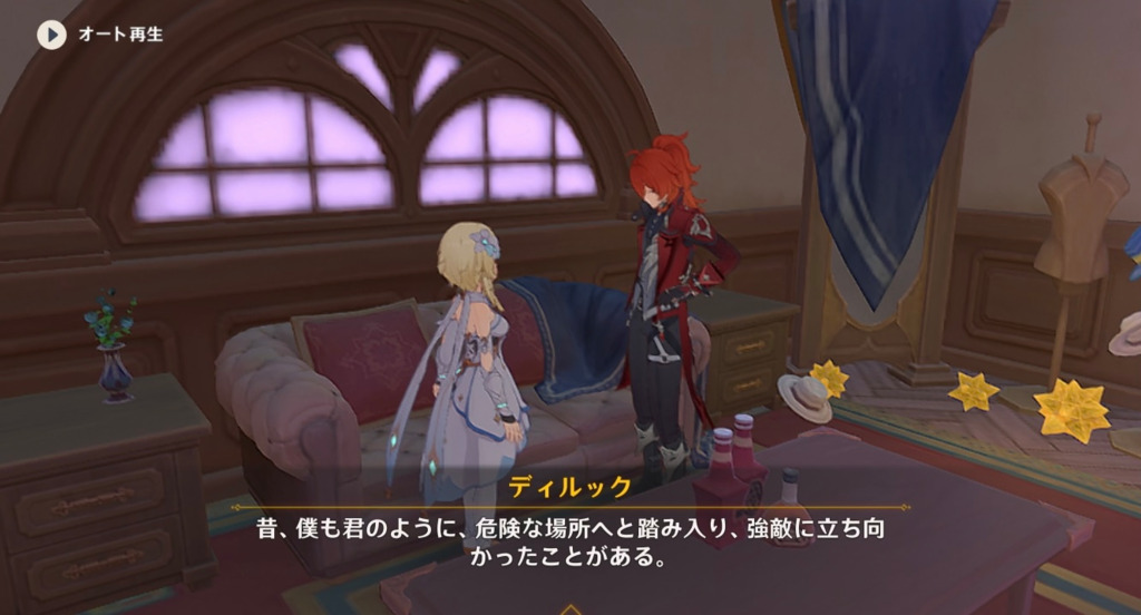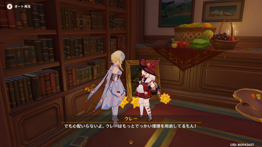 ③休まずにずっと遊んでると、次の日は疲れて遊べなくなる…そしたら損しちゃうぞって、ガイアお兄ちゃんが教えてくれたんだ。だからクレーはお日様と一緒に起きて、お日様と一緒におうちに帰るの! おかげで毎日元気いっぱい! 栄誉騎士のお兄ちゃん/お姉ちゃんも、ガイアお兄ちゃんの言うことを聞くんだよ!