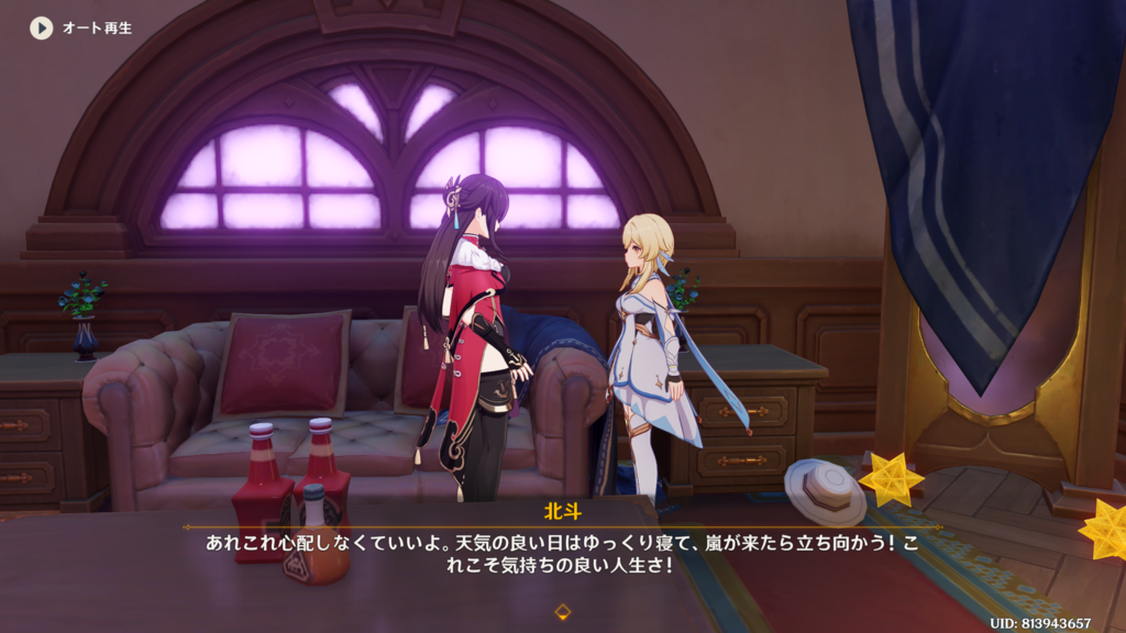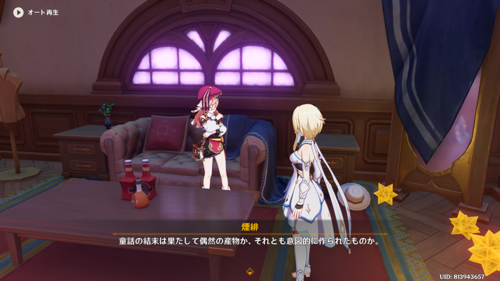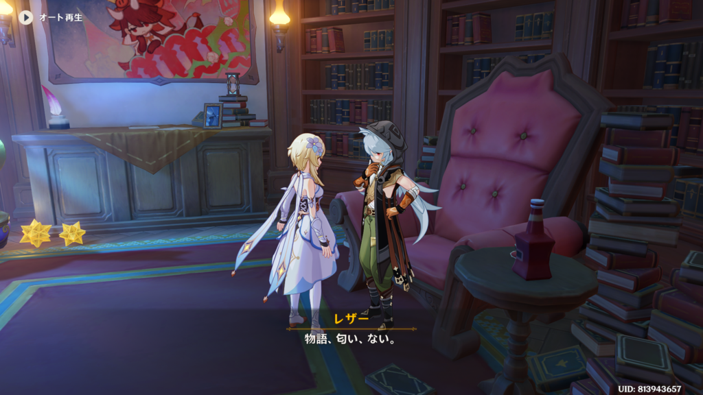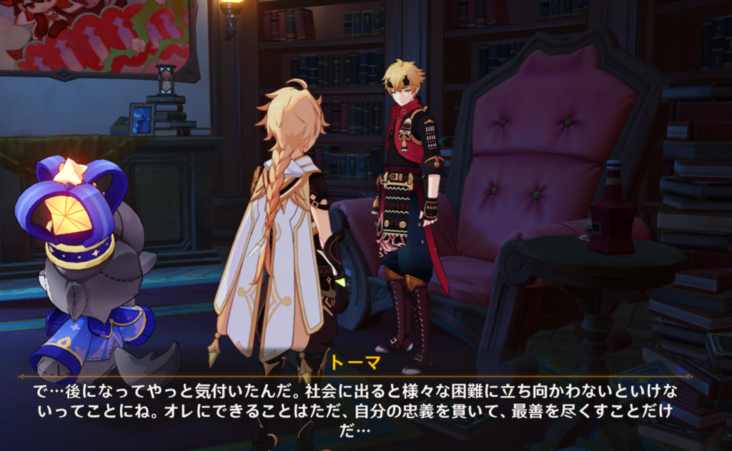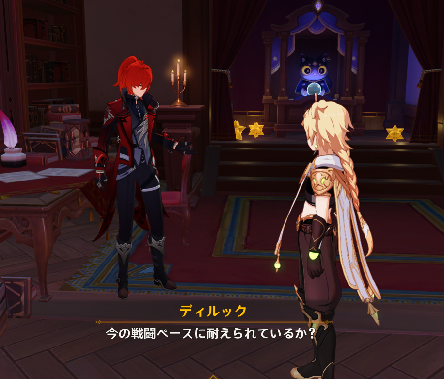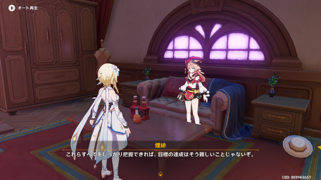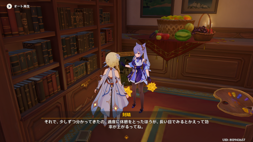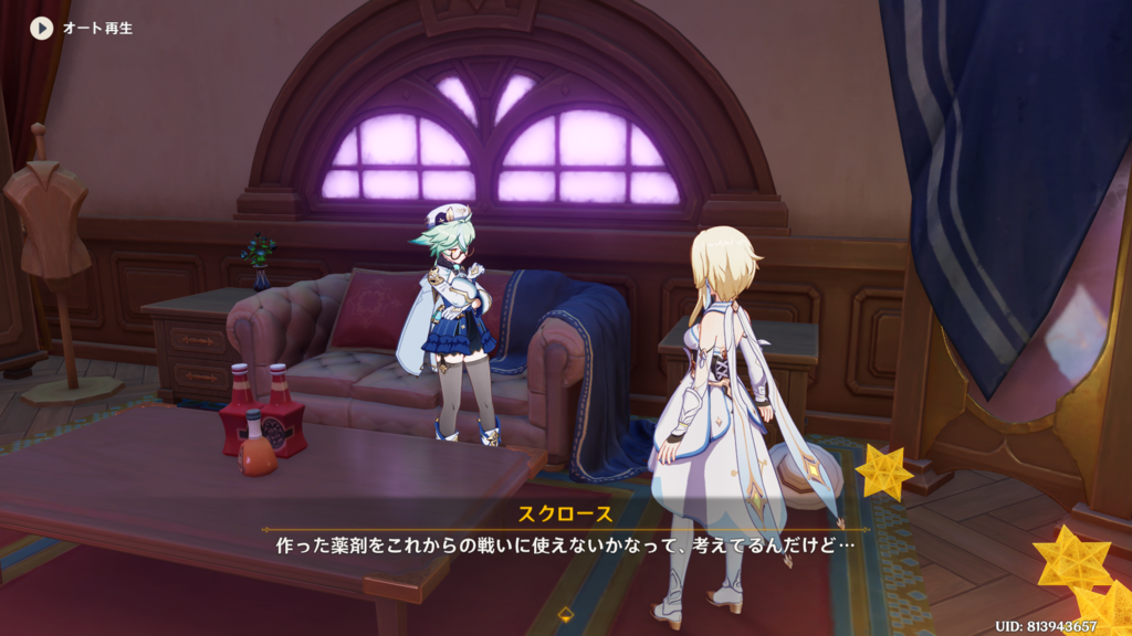 ③休まずにずっと遊んでると、次の日は疲れて遊べなくなる…そしたら損しちゃうぞって、ガイアお兄ちゃんが教えてくれたんだ。だからクレーはお日様と一緒に起きて、お日様と一緒におうちに帰るの! おかげで毎日元気いっぱい! 栄誉騎士のお兄ちゃん/お姉ちゃんも、ガイアお兄ちゃんの言うことを聞くんだよ!