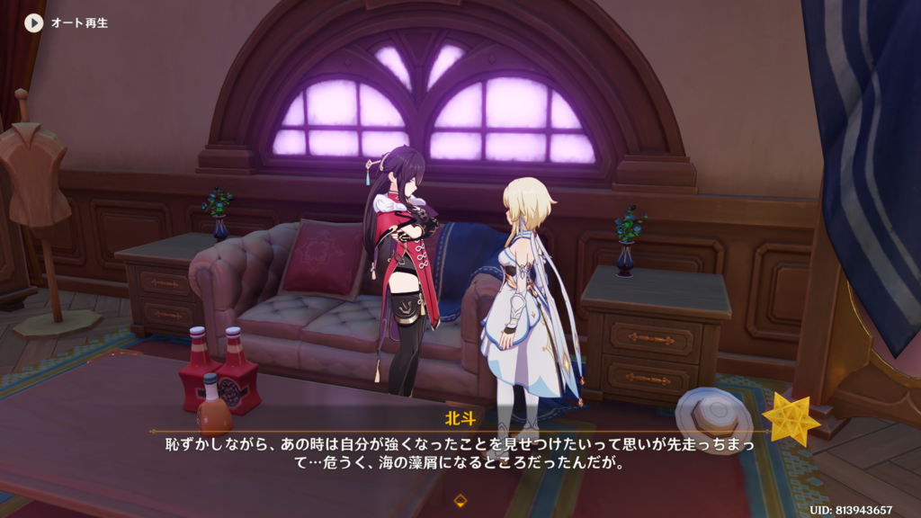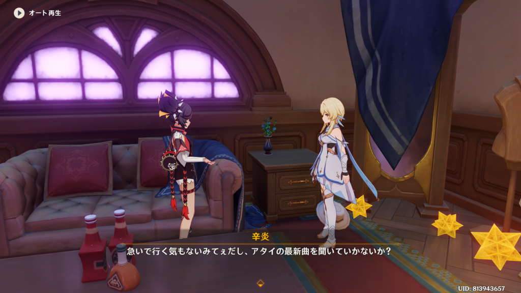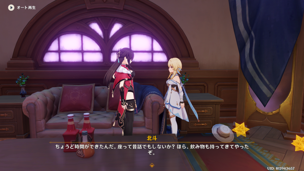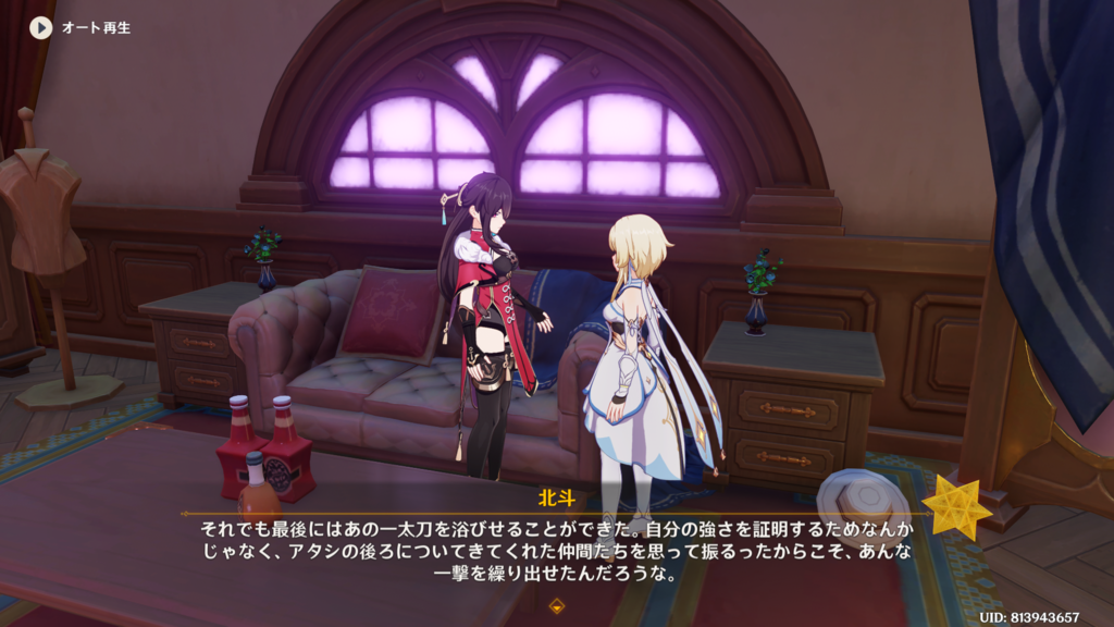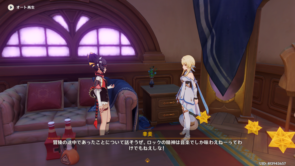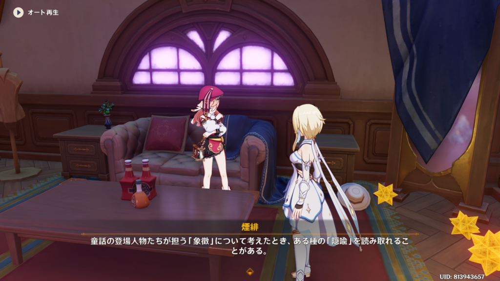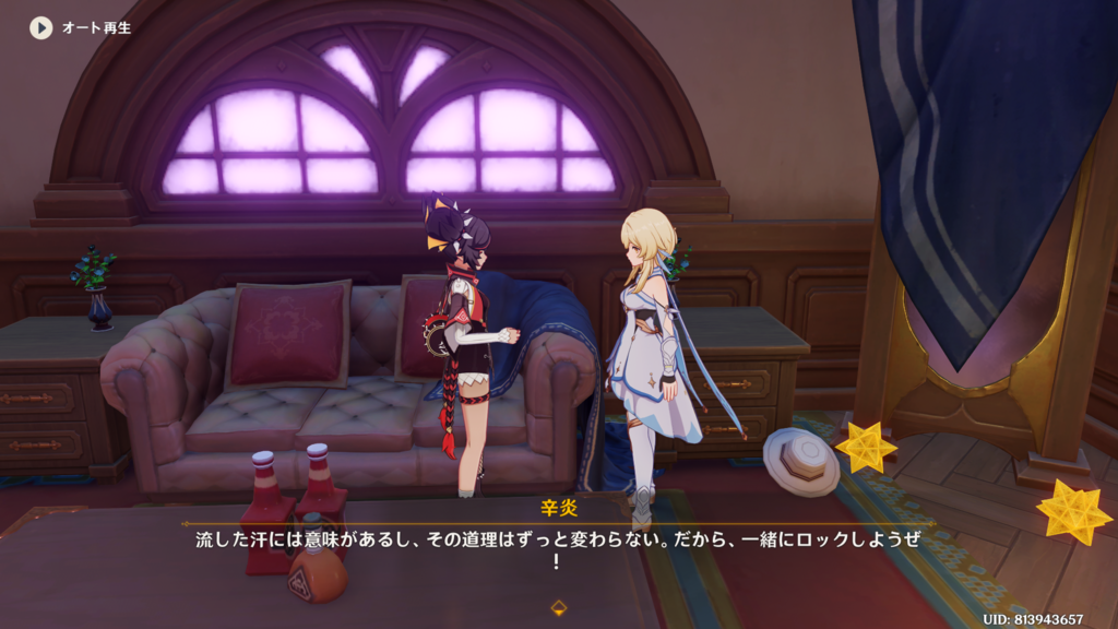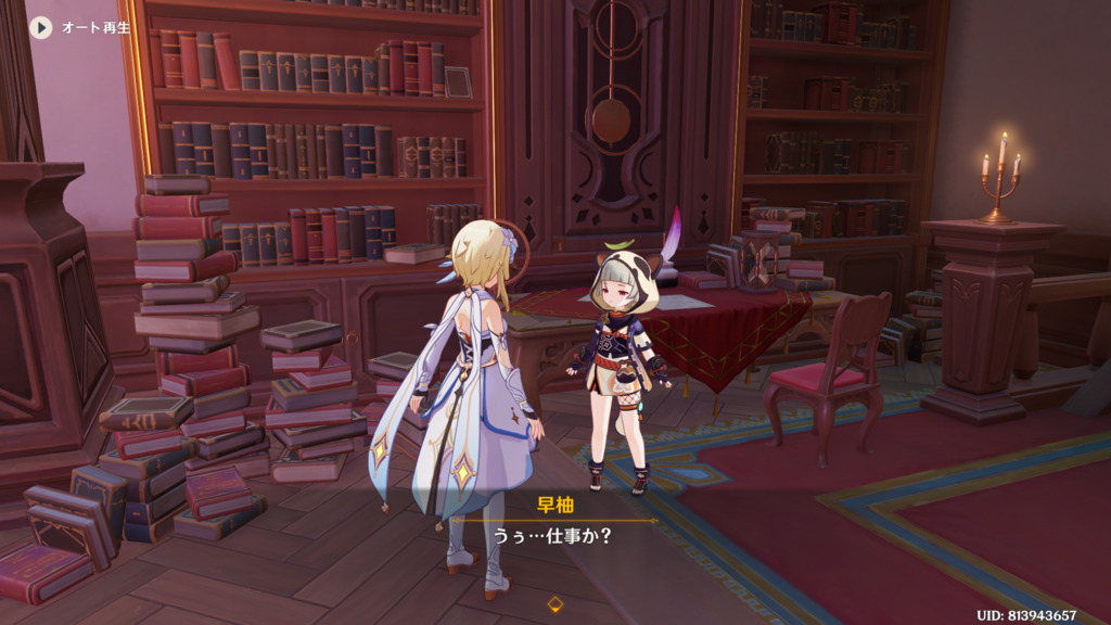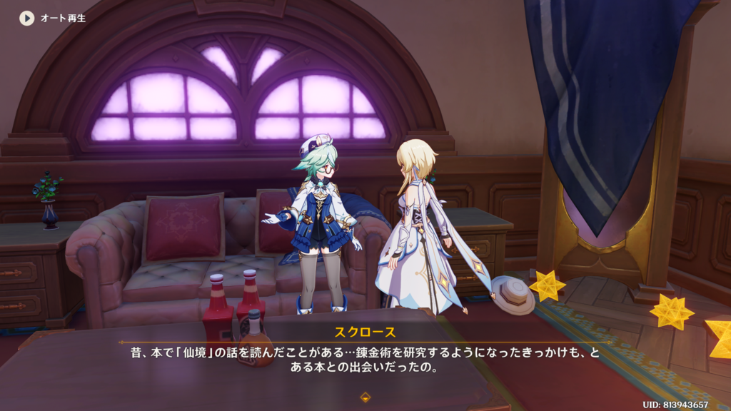 ③休まずにずっと遊んでると、次の日は疲れて遊べなくなる…そしたら損しちゃうぞって、ガイアお兄ちゃんが教えてくれたんだ。だからクレーはお日様と一緒に起きて、お日様と一緒におうちに帰るの! おかげで毎日元気いっぱい! 栄誉騎士のお兄ちゃん/お姉ちゃんも、ガイアお兄ちゃんの言うことを聞くんだよ!