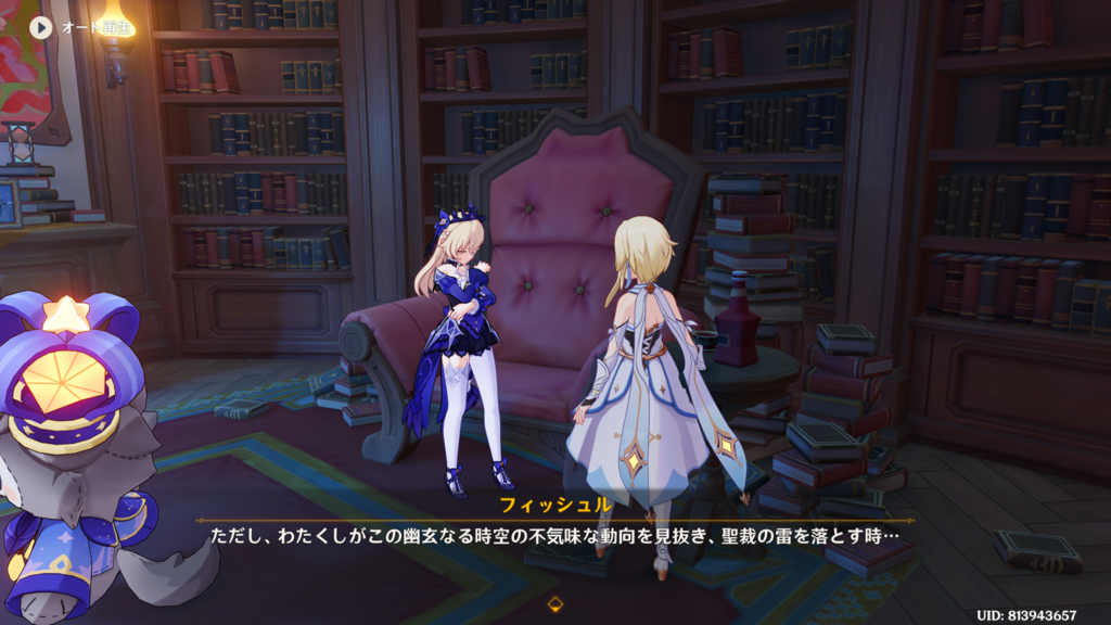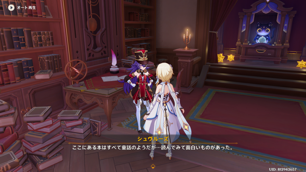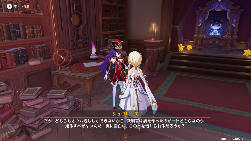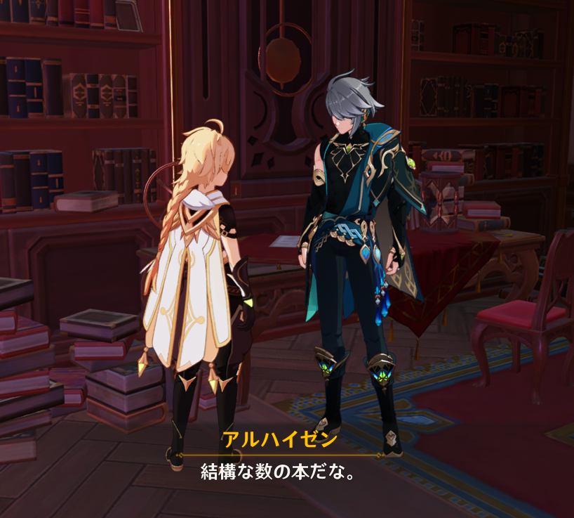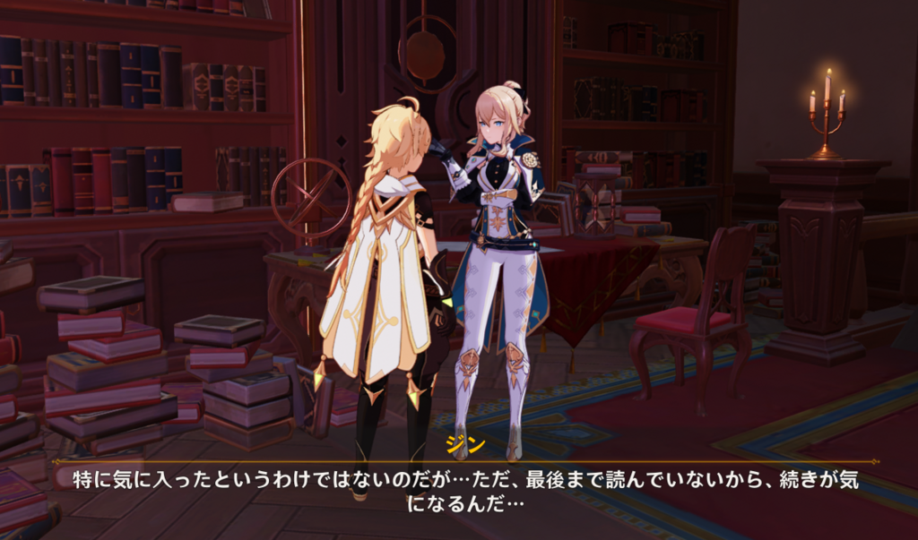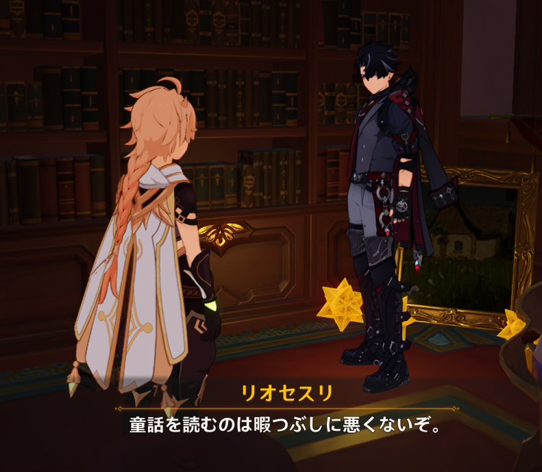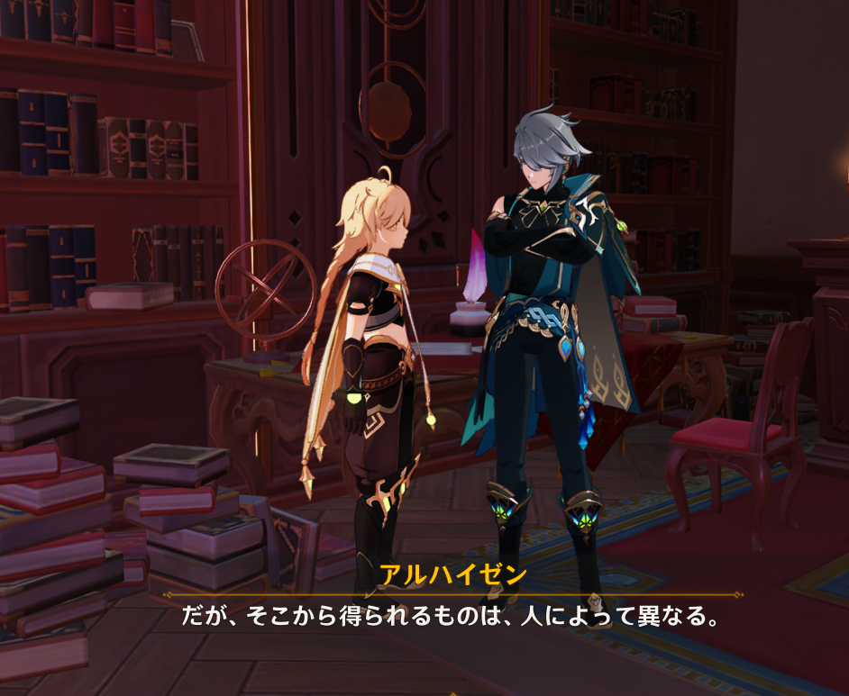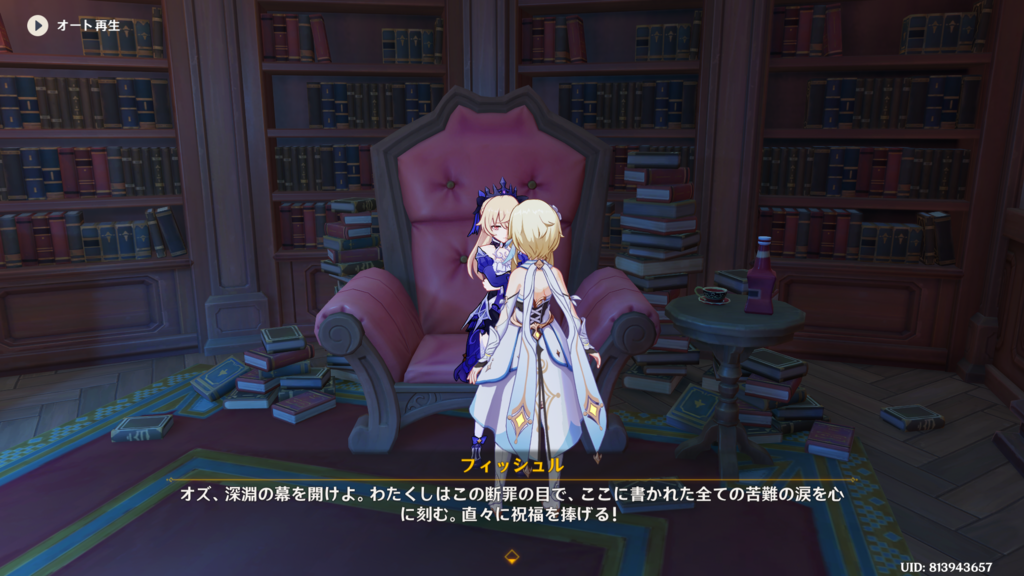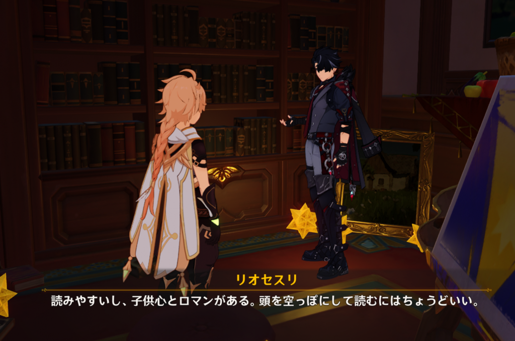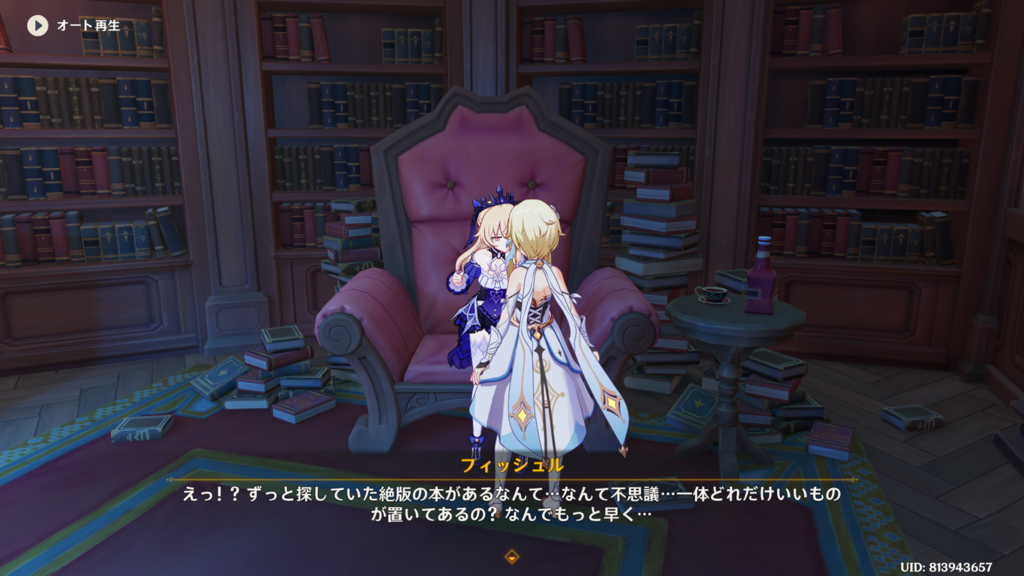 ③えっ!? ずっと探していた絶版の本があるなんて…なんて不思議…一体どれだけいいものが置いてあるの? なんでもっと早く… コホンッ! この天地の運命を定めた絵図はなかなかに面白い。オズ、深淵の幕を開けよ。わたくしはこの断罪の目で、ここに書かれた全ての苦難の涙を心に刻む。直々に祝福を捧げる!