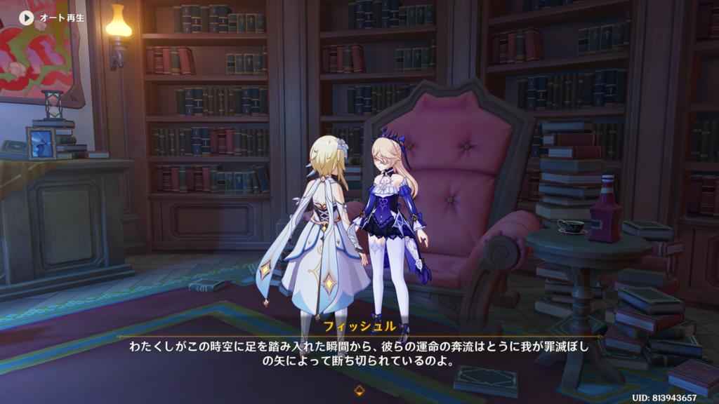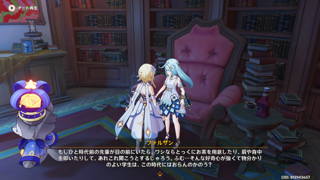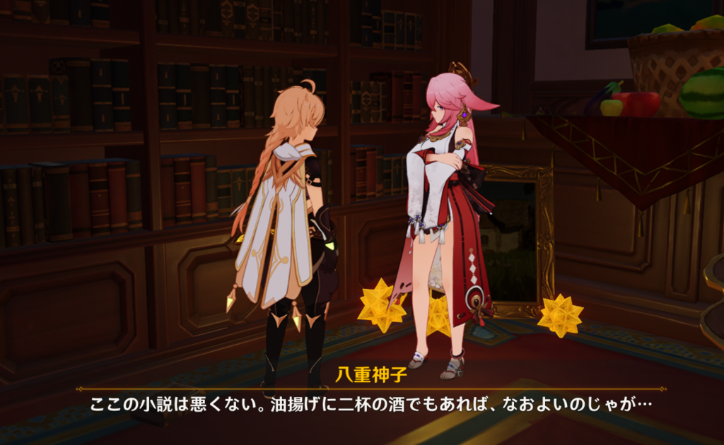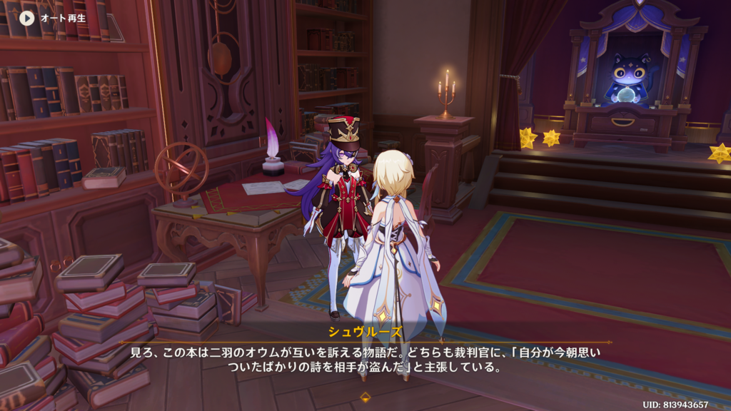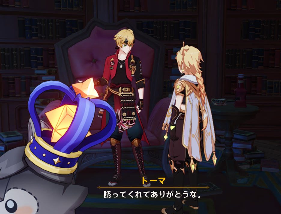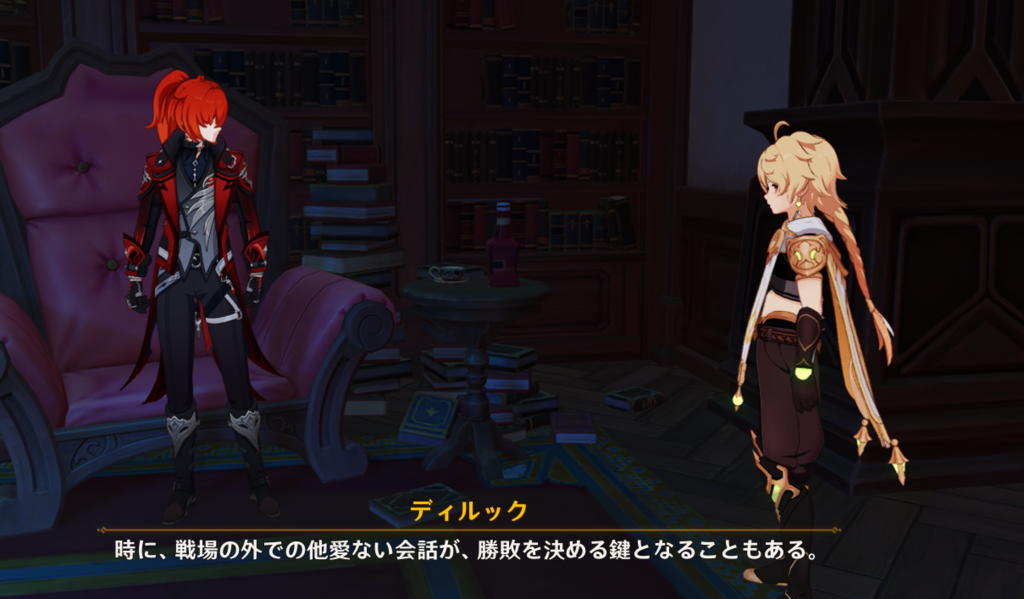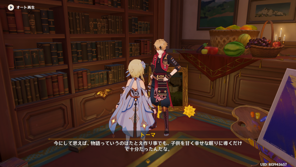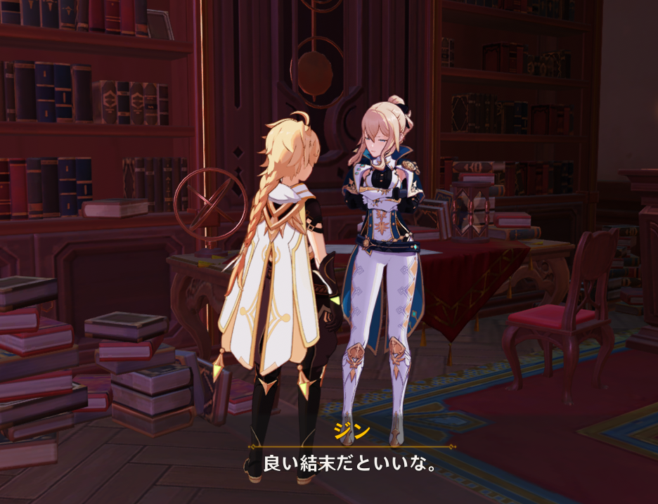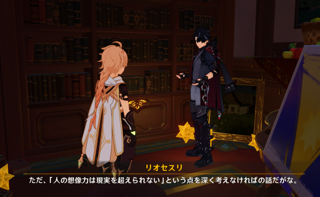 ③えっ!? ずっと探していた絶版の本があるなんて…なんて不思議…一体どれだけいいものが置いてあるの? なんでもっと早く… コホンッ! この天地の運命を定めた絵図はなかなかに面白い。オズ、深淵の幕を開けよ。わたくしはこの断罪の目で、ここに書かれた全ての苦難の涙を心に刻む。直々に祝福を捧げる!