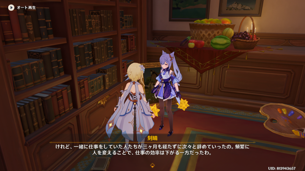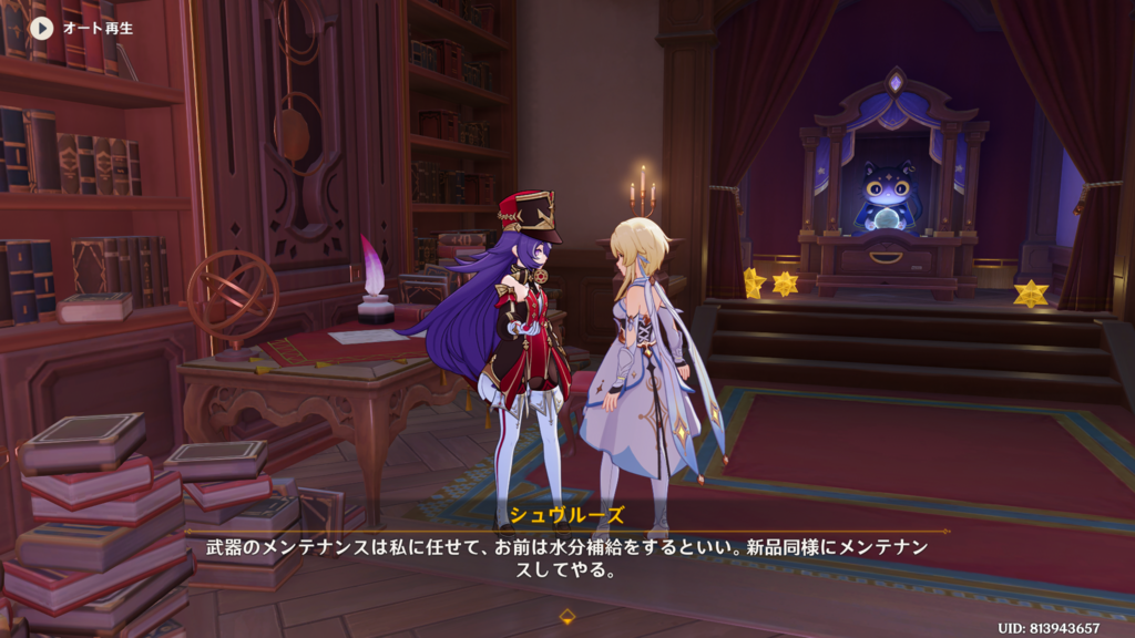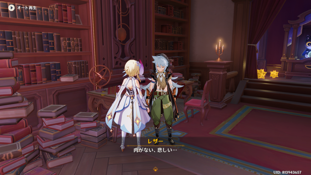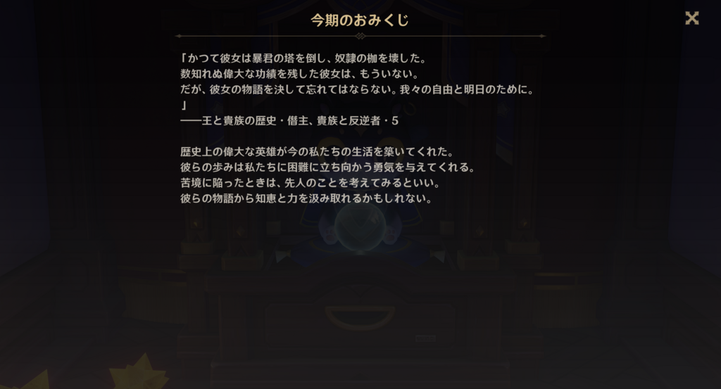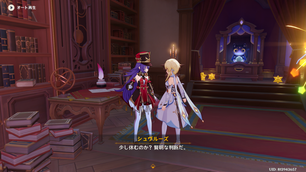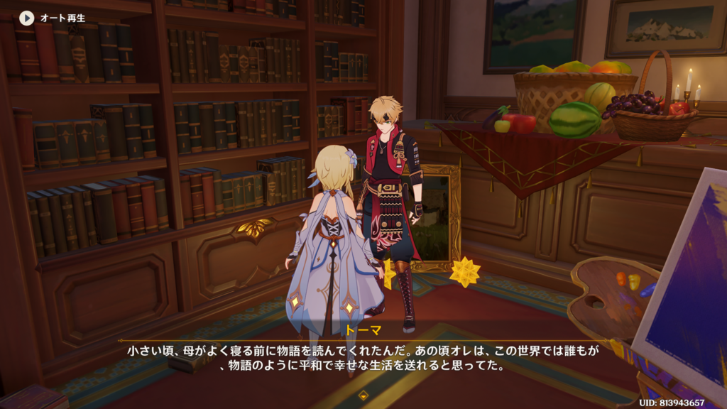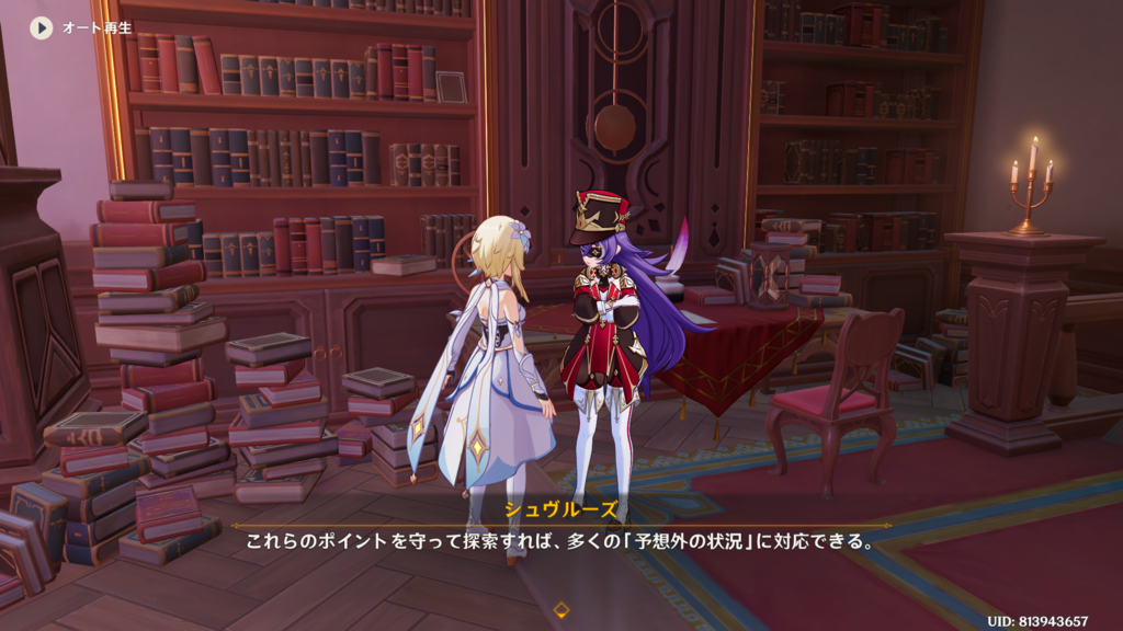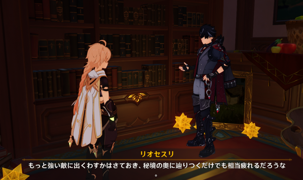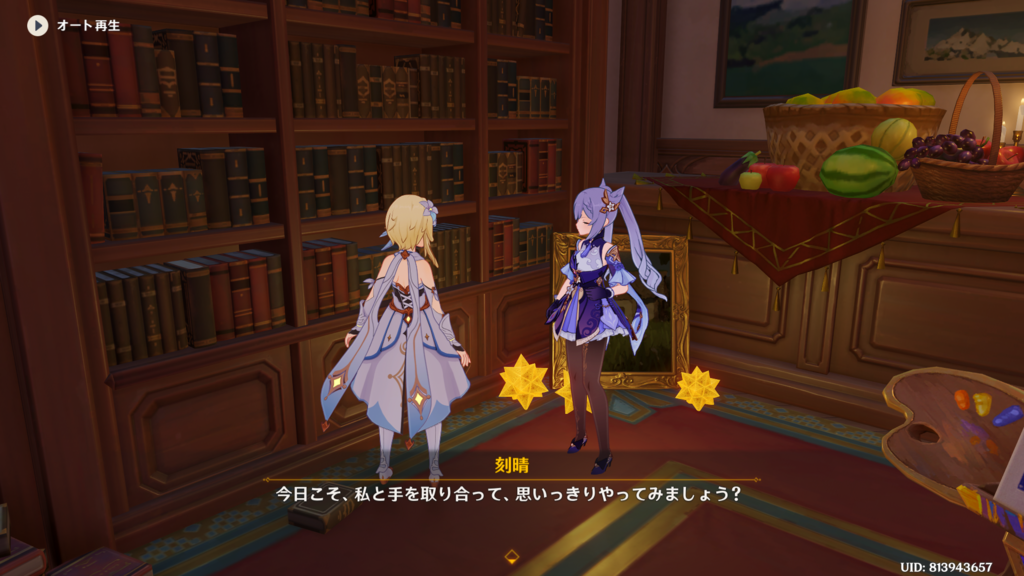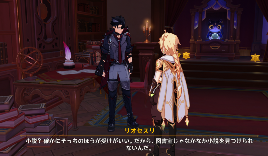 ③えっ!? ずっと探していた絶版の本があるなんて…なんて不思議…一体どれだけいいものが置いてあるの? なんでもっと早く… コホンッ! この天地の運命を定めた絵図はなかなかに面白い。オズ、深淵の幕を開けよ。わたくしはこの断罪の目で、ここに書かれた全ての苦難の涙を心に刻む。直々に祝福を捧げる!