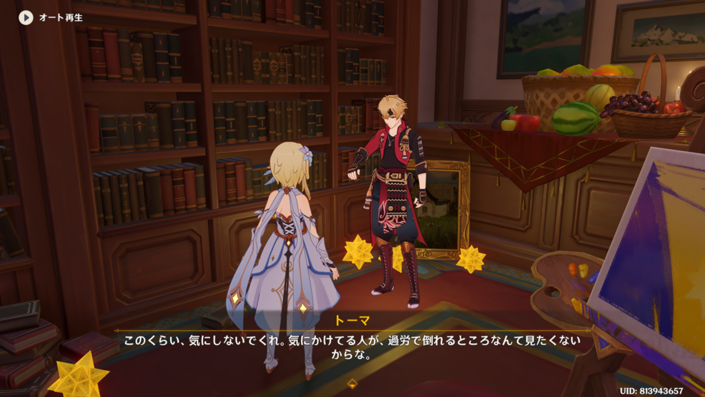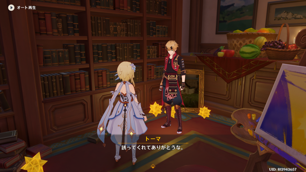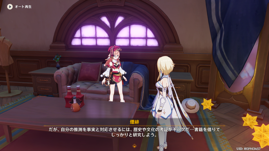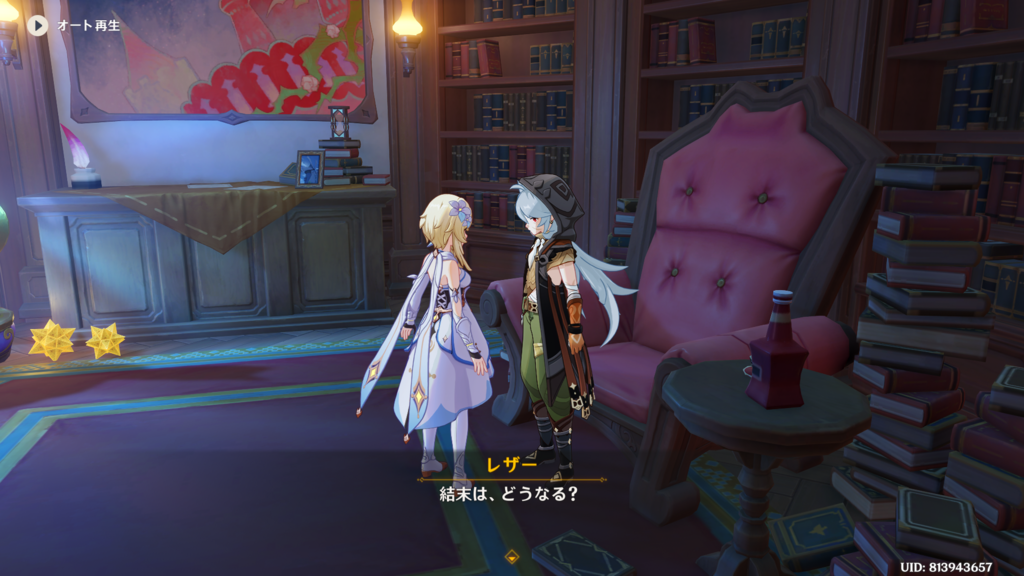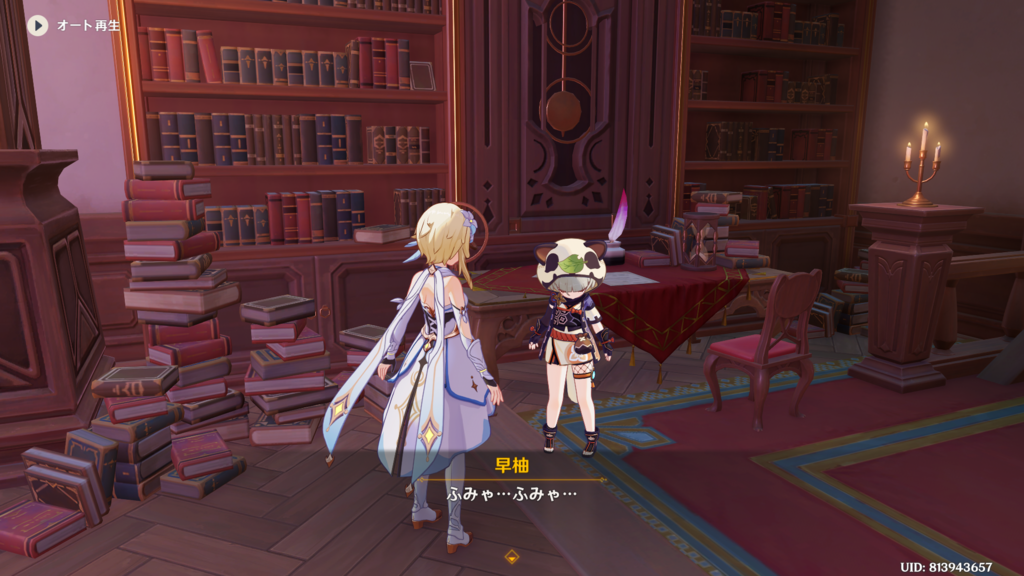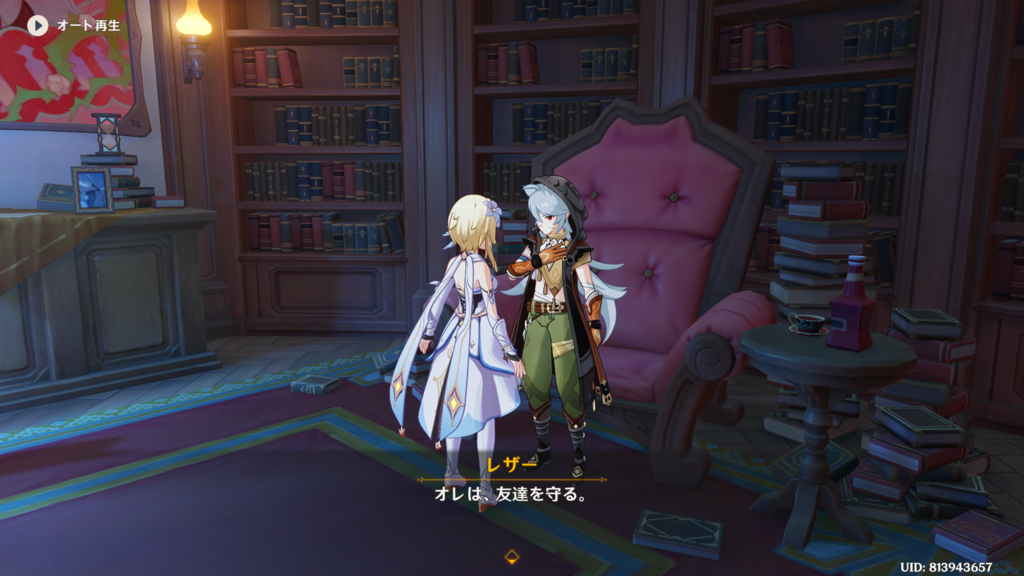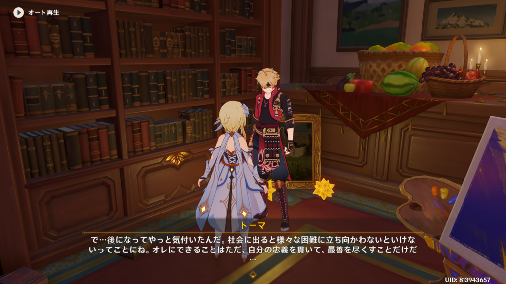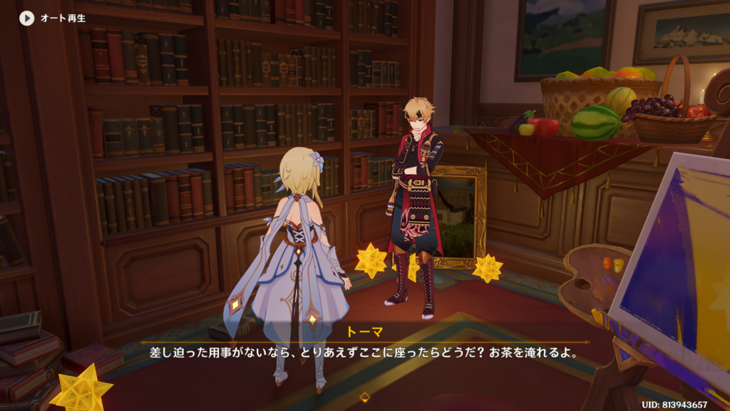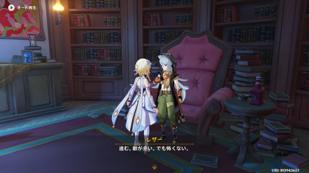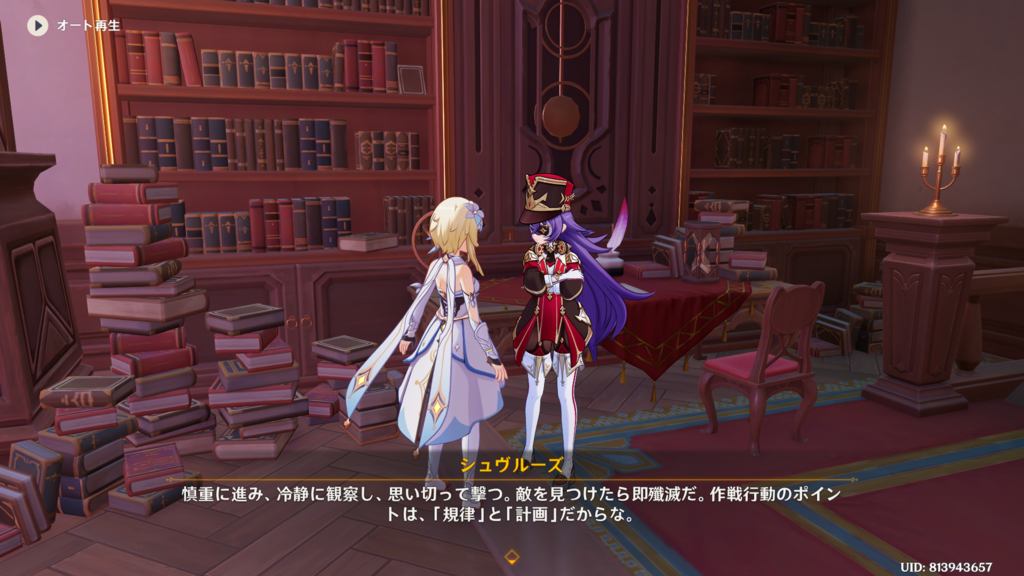 ③えっ!? ずっと探していた絶版の本があるなんて…なんて不思議…一体どれだけいいものが置いてあるの? なんでもっと早く… コホンッ! この天地の運命を定めた絵図はなかなかに面白い。オズ、深淵の幕を開けよ。わたくしはこの断罪の目で、ここに書かれた全ての苦難の涙を心に刻む。直々に祝福を捧げる!