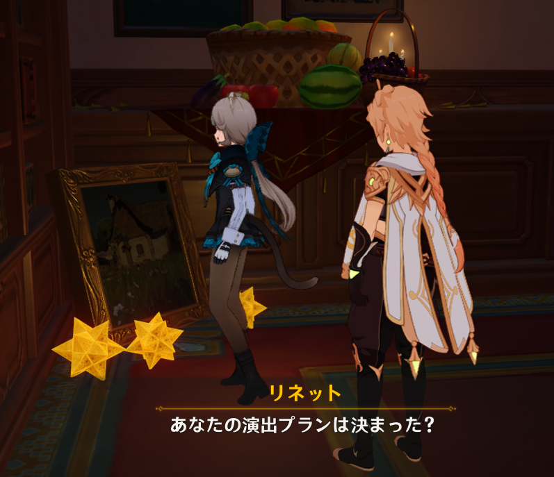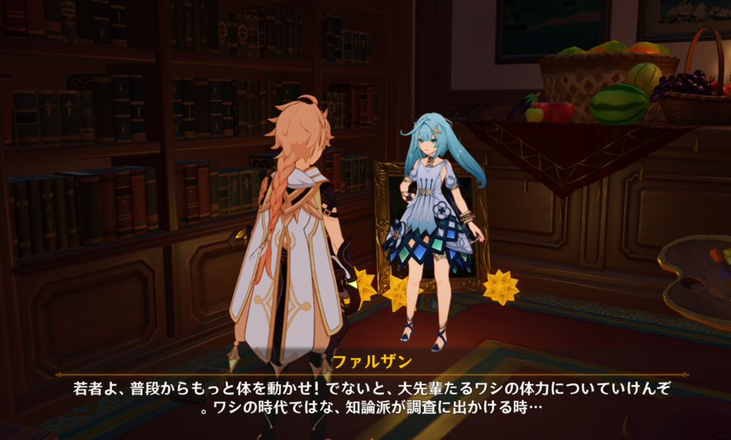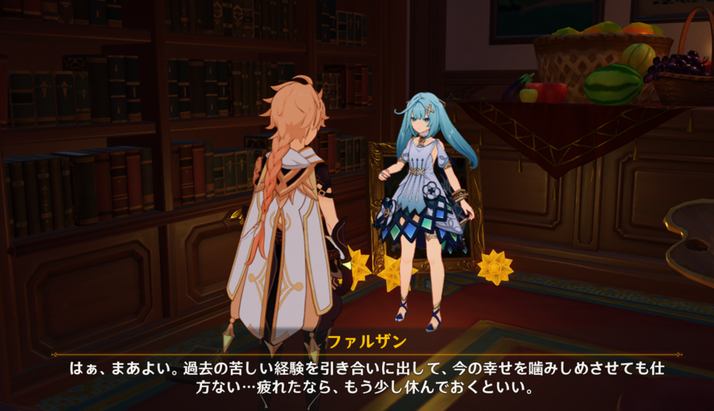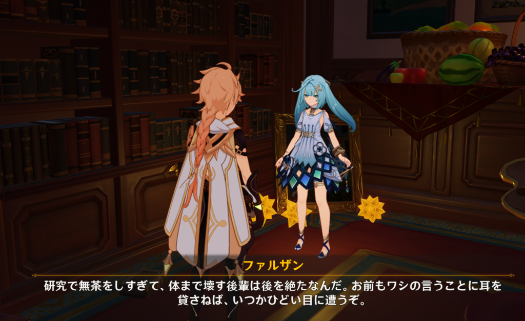 シアター内での会話スクショ、よければ☺ 伝説の人物ファルザン先輩① ② ③ 休憩ガチ勢アルハイゼン① ② ③ アシスタントリネット① ② ③