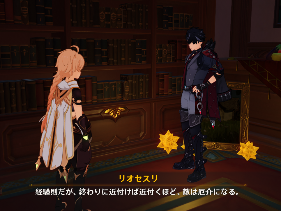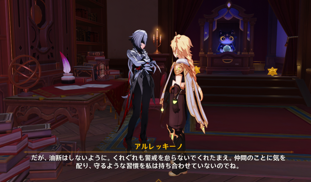 ②程度の低い相手ばかりだ。君がもてなしてやるといい。だが、油断はしないように。くれぐれも警戒を怠らないでくれたまえ。仲間のことに気を配り、守るような習慣を私は持ち合わせていないのでね。手に負えない相手に遭遇したらすぐ下がるといい。そういうのは私に任せてくれ。