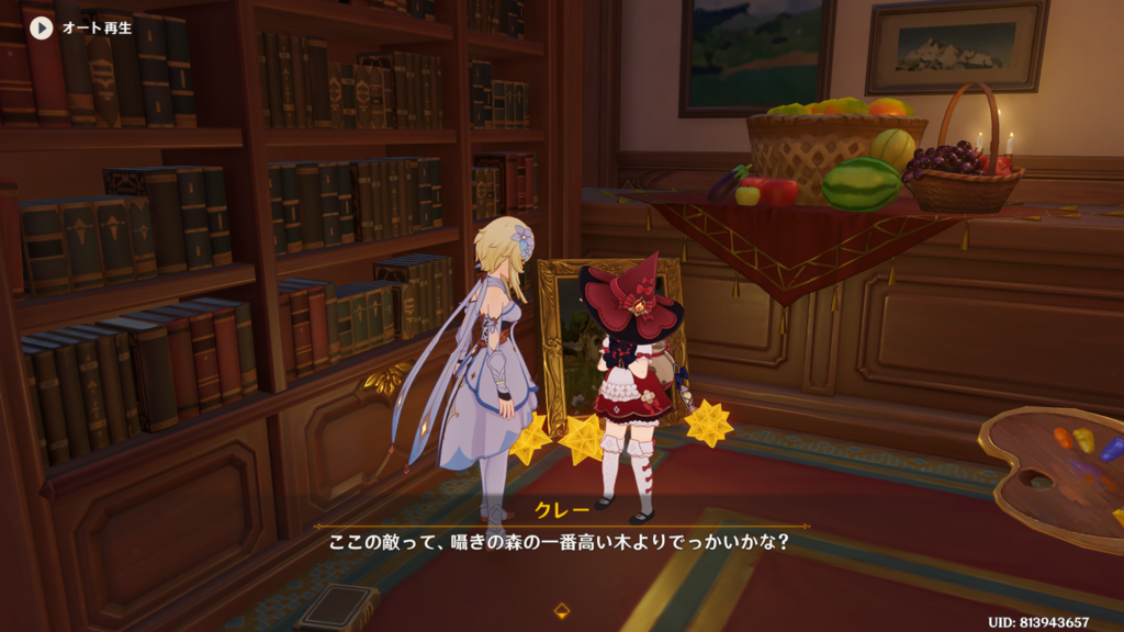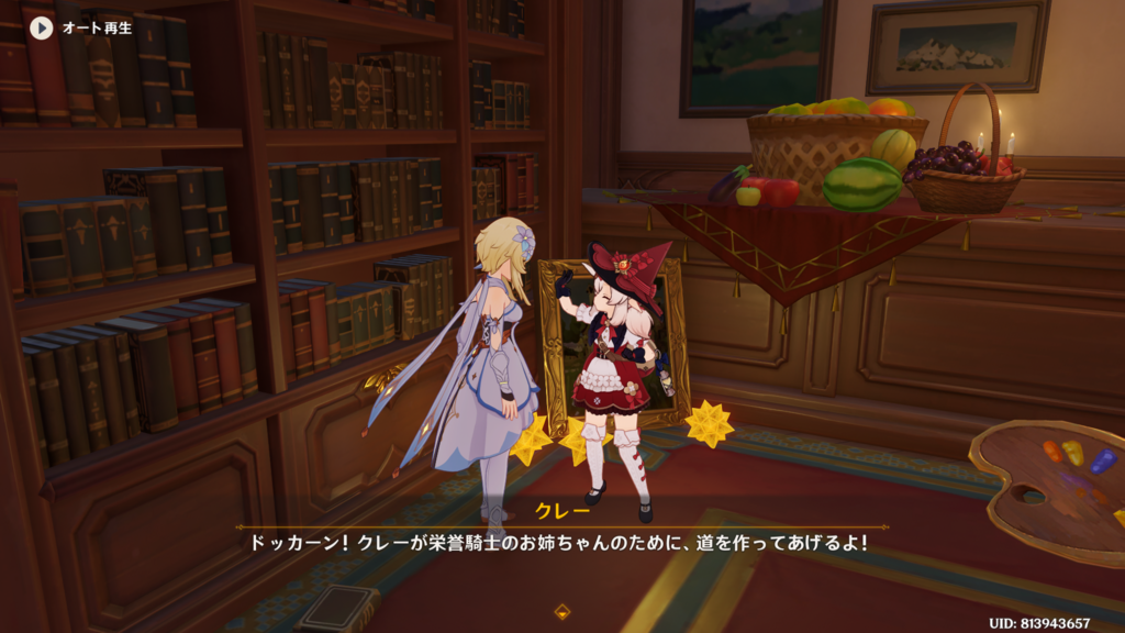 ①栄誉騎士のお兄ちゃん/お姉ちゃん! ここ、ママが読んでくれたお話がたくさんあるよ! あるお話の途中でね、クレーは「えっ、そんなぁ」って、がっかりしちゃったの。そしたらママが紙とペンを出して、クレーに書き直させてくれたんだ。窓のそばとか、草むらの中とか、木の上とか…クレーはいつも物語のシーンのどこかに、ドドコを入れてるんだよ!