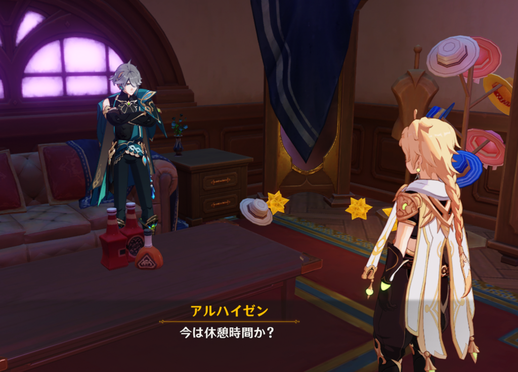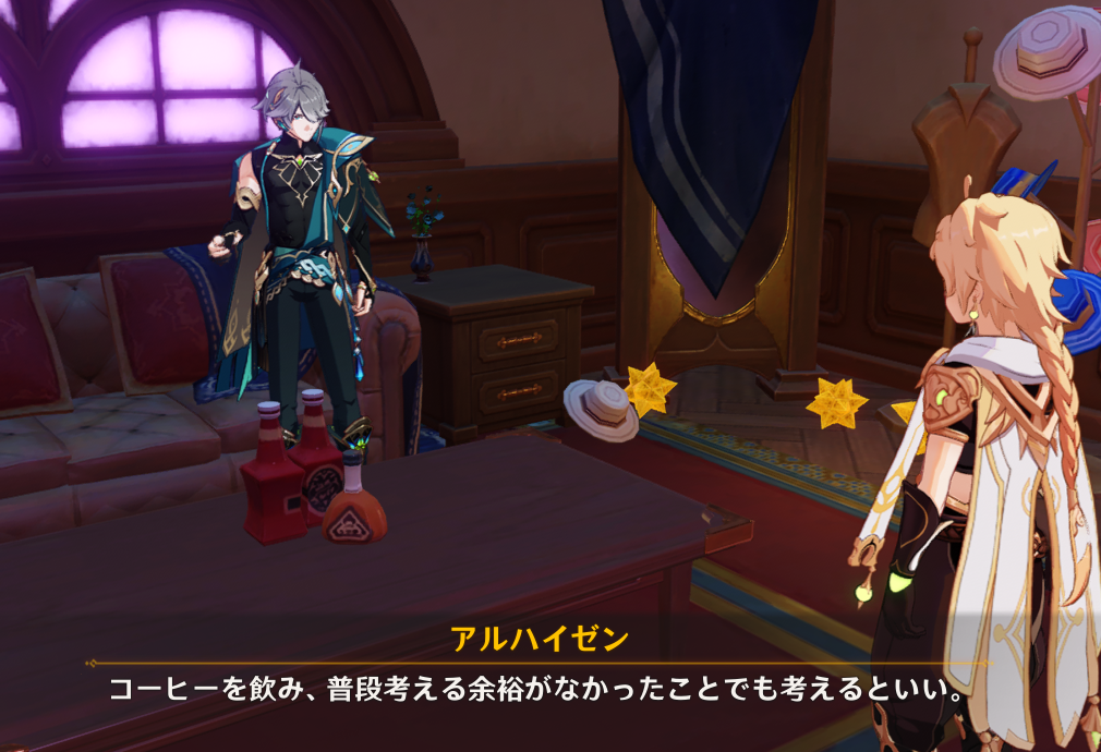 ①今から休む? ああ、私も賛成だ。確かに君は疲れているようだからね。自分のことを正しく認識するのはいいことだ。歩みを緩めてこそ、遠くまで辿り着ける。コーヒーキャンディを持ってきたんだ。君に一つあげよう。さあ、どうぞ。