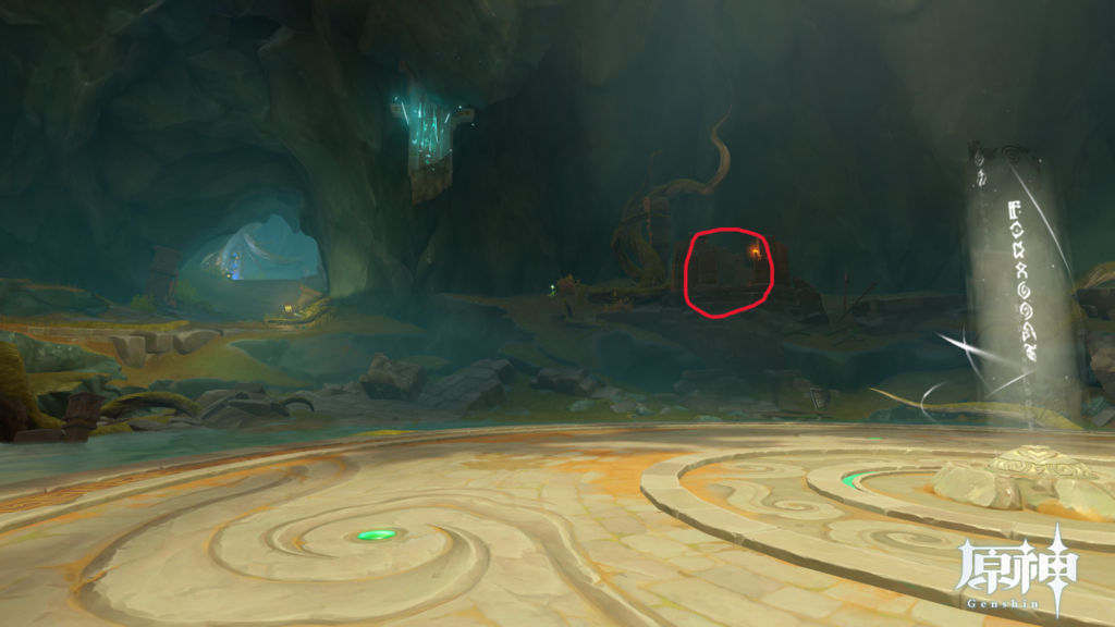 進んだ先にワープポイントがあり戦闘イベントが発生します。ワープポイントからみて左手側(画像内では赤丸で囲った位置)に普通の宝箱があり、中身が暗鉄剣でした。