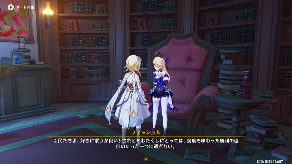 ①フン、ここを行き来するものどもは、簒奪者の主の捨て駒に過ぎない。わたくしがこの時空に足を踏み入れた瞬間から、彼らの運命の奔流はとうに我が罪滅ぼしの矢によって断ち切られているのよ。臣民たちよ、好きに歌うが良い! されどもわたくしにとっては、幾度も味わった勝利の遠征のたった一つに過ぎない。
