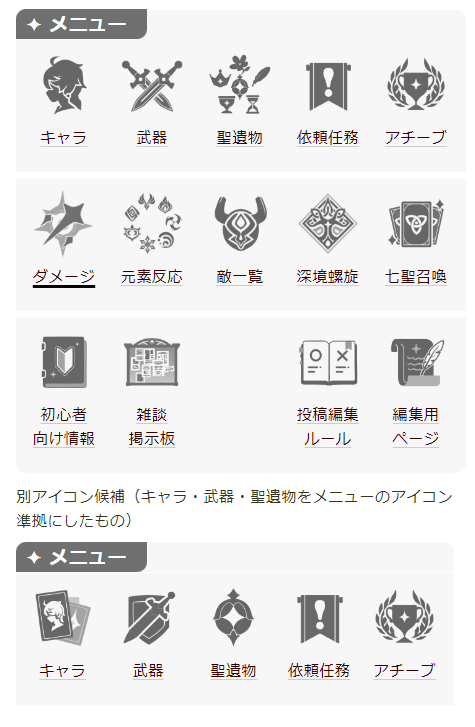 - 武器と聖遺物のアイコンはメニューのアイコンに準拠したデザインでまとめ、差し替えの候補として見れるようにしました。