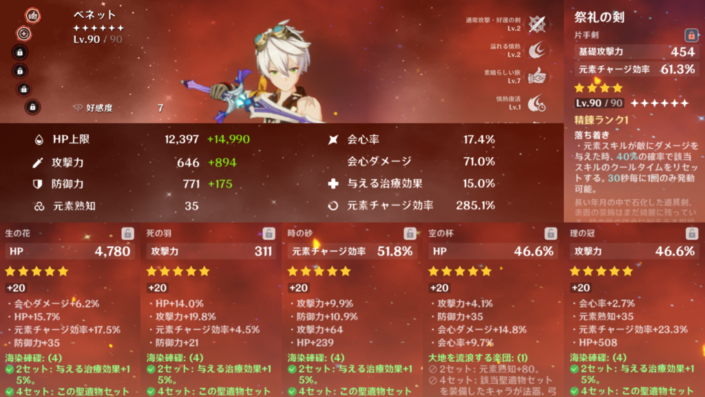 ベネットのHPが70%以上あり、他に発生する粒子を一切計算しないなら一段チャージが粒子3個発生なので2連打で6、エネルギー回復量は18になるので300%以上は必要ですね(大体334%くらいかな?)