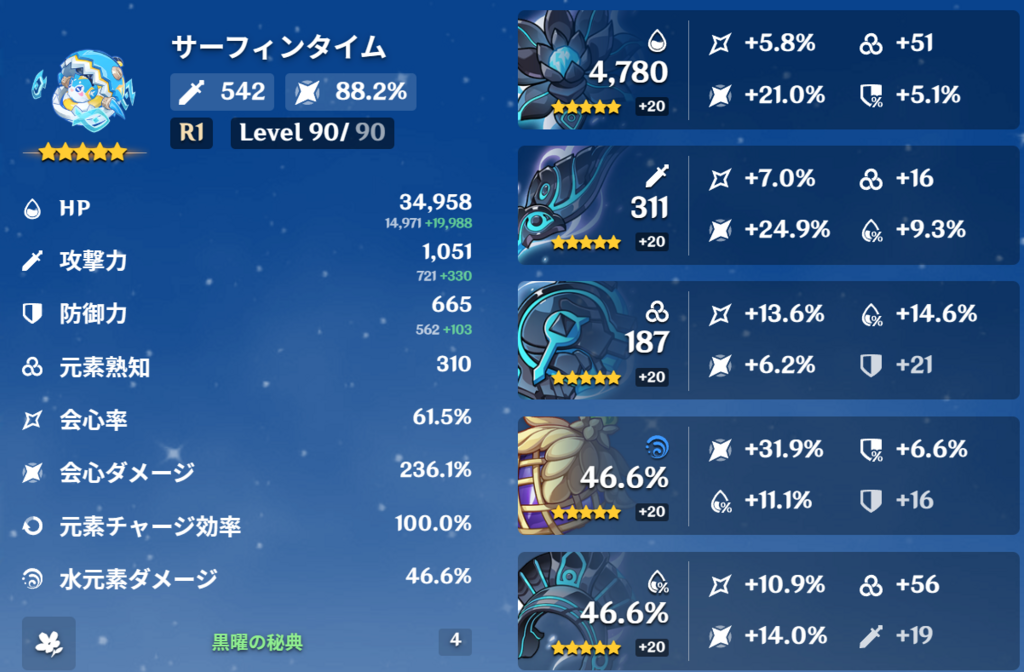 フィールド探索くらいなら十分ありだよ。ムアラニ・イネファ・アイノにあと一人は炎旅人orスクロースor心海の月感電編成で探索してる。月感電なら会心大事だから黒曜や餅武器も腐りにくい