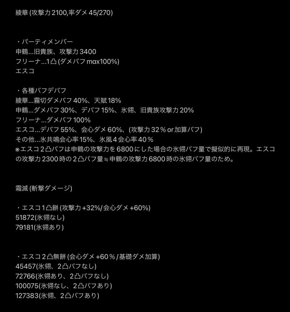 気になったから綾華で霜滅の斬撃ダメージ比較してみた。フルバフ+2凸効果が乗ると、氷翎あり/なしいずれの場合も元のダメージから約5万ダメージほど上昇して(!?!?)、5回分で合計約25万ダメージ上がった。2凸バフ切れた後は1凸餅が当然盛り返すんだけどそれでも合計10万くらい取り返せるだけ。たった5回分のバフとはいえ1回のバフ量がちょっと異常すぎるんで、メインアタの火力を上げるなら流石に2凸の方がよさげ