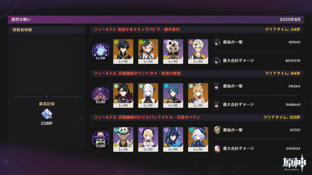 放浪者からトゥライトゥーラR5を奪い取った翠緑火力型イファ(トリクラ)です。最大合計ダメージが若水R1黄金フィッシュルだから実態はオズドライバー型イファかもしれない……。オロルンは終焉R5絵巻、フリーナは西風千岩でした。最強の一撃はバフが全部乗った爆発だと思う。私の調べた範囲だとクリア編成はイネファ入りばかりで、イネファいない私は今期アルティメットは無理かなあと思ってたけどなんとかなりました(会心とイファの完凸効果の上振れを引けるまで4時間格闘