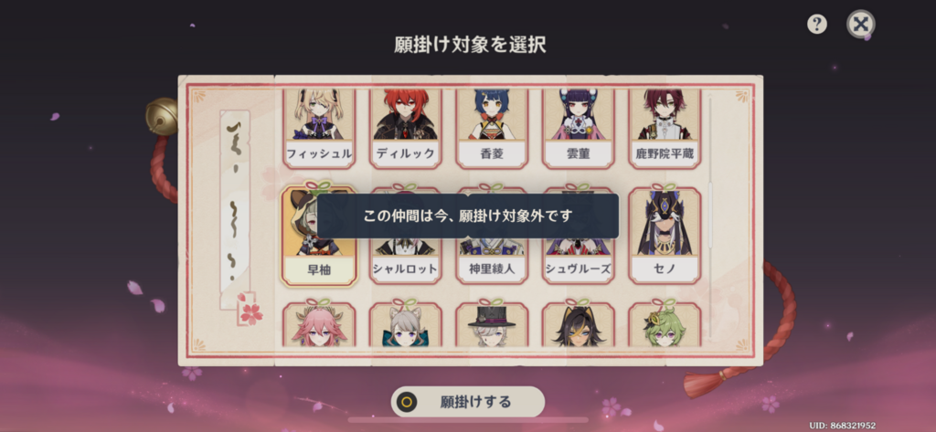 早柚ちゃんを旅行記を指定願掛けしようとしたら「願掛け対象外」と出ました。平蔵の旅行記の進行度が関係してるんでしたっけ??