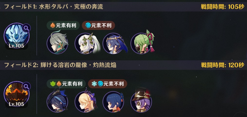 たぶんだけどタルパはマーヴィカ/香菱/イアンサ/シャルロット、龍像は香菱をアンバーにしたらギリ行けそう。タルパは耐性貫通殆ど無い編成になるから育成状況が物を言うけどギミックで旋火輪が複数回回せるのとシャルロットで子タルパ処理、龍像の炎耐性で香菱がほぼダメージ貢献無いから炎付着の強いアンバーに旧貴族ループして貰えば火力が上がる筈。龍像に関してはキィニチ/エミリエ/アンバー/ベネットでも良さそうだけど武器が微妙そうなんで出来たらやってみて欲しい