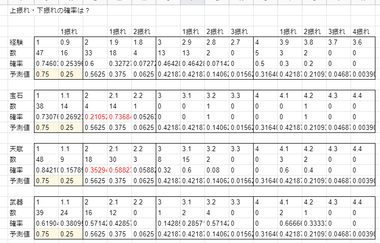上振れ・下振れの確率を考えていました。経験値本については抽選ごとに25%で下振れと考えると実測値に沿いますが、それ以外は2回以上抽選された時に上振れ確率の逆転があり、抽選回数によって確率が変動している可能性があります(画像参照)