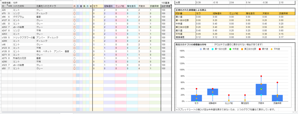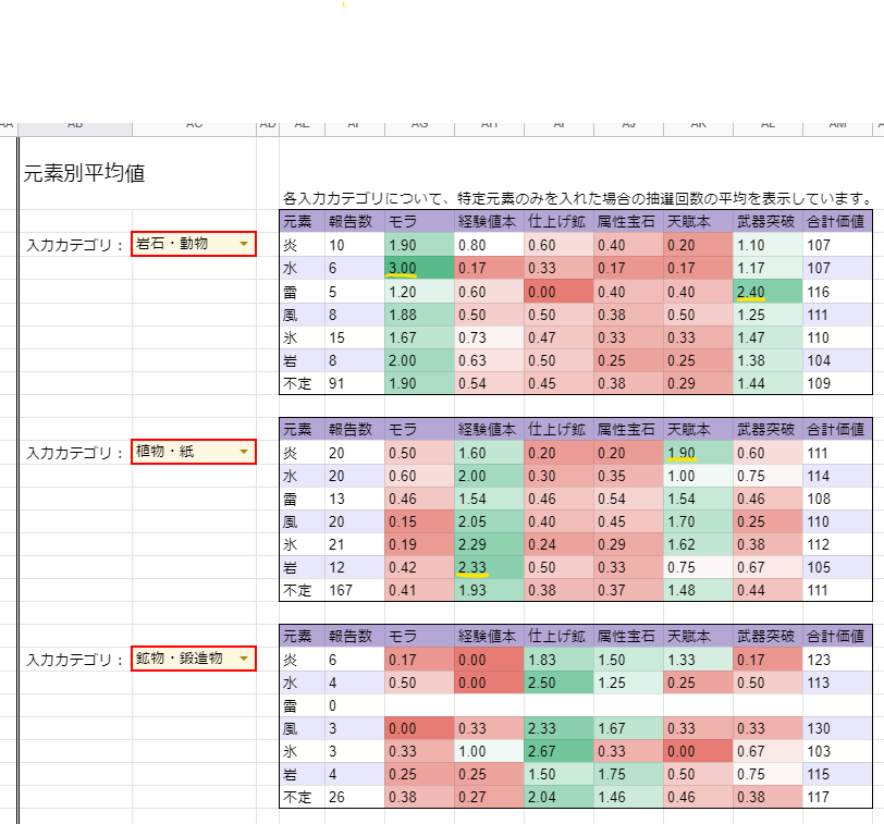 各カテゴリについて「特定元素のみを入れた場合の抽選回数の平均値」を入力別平均値シートで閲覧可能になりました。