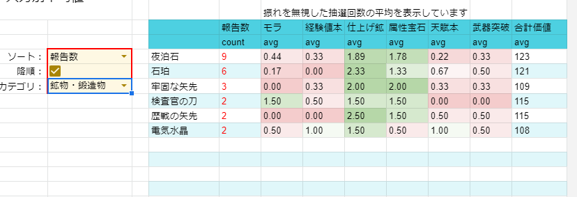 はい、入力別平均値シート内一番左の「単一入力別平均値」の表で各アイテムの報告数を見て、wikiの「変化傾向」の項内に折りたたんで入れてあります。