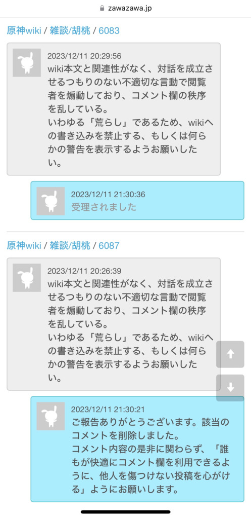 通報履歴 で、あなたの通報と対応時のメッセージを確認できます。