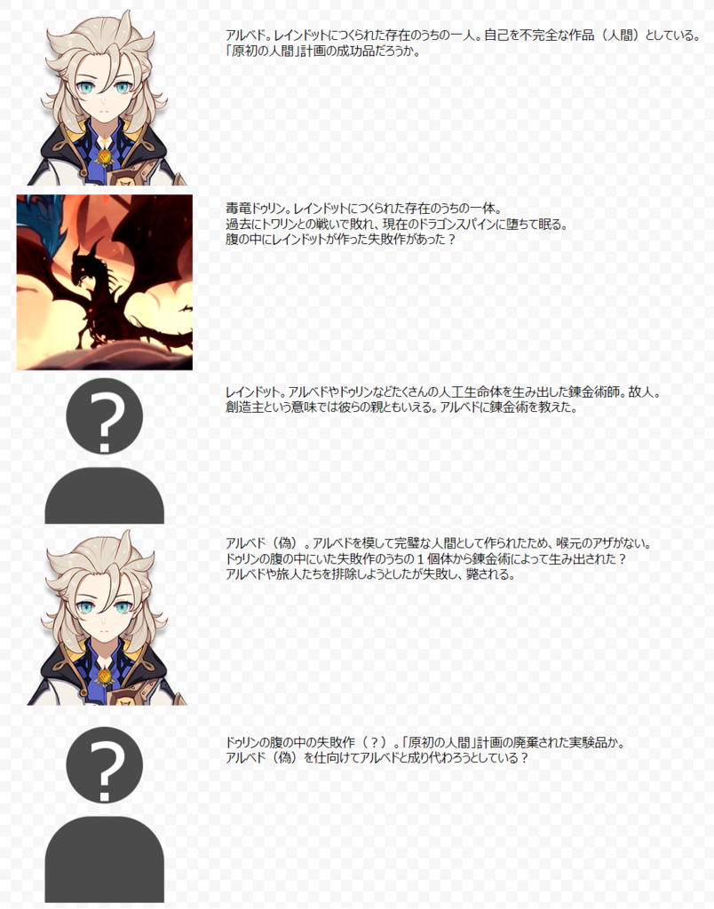トリックフラワー倒した後に旅人も怪しんでたし泥棒を追いかけてた時に接触したのが失敗作=最後のムービーのもう一人なのかなって。だからまあ実質アルベドの姿をした存在が3人(本物、失敗作、トリックフラワー)いたことになると理解してる。