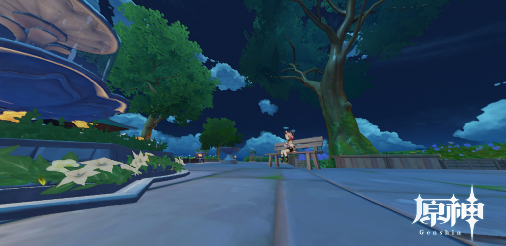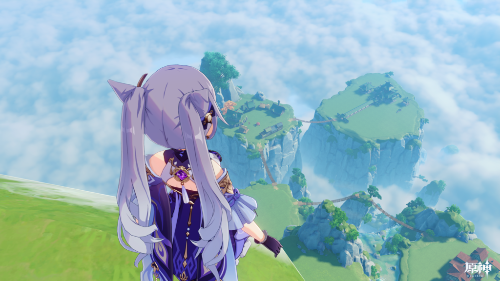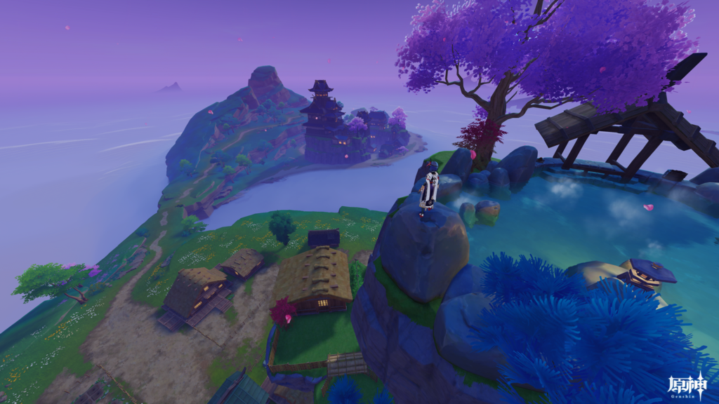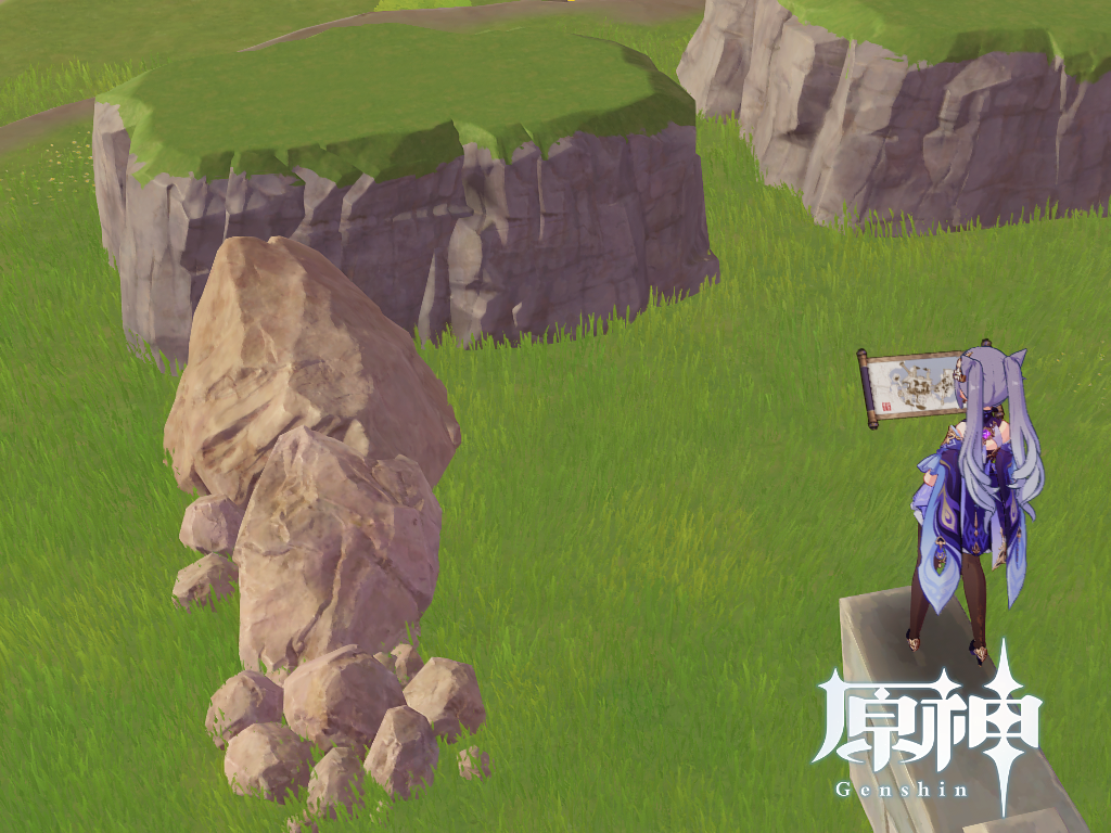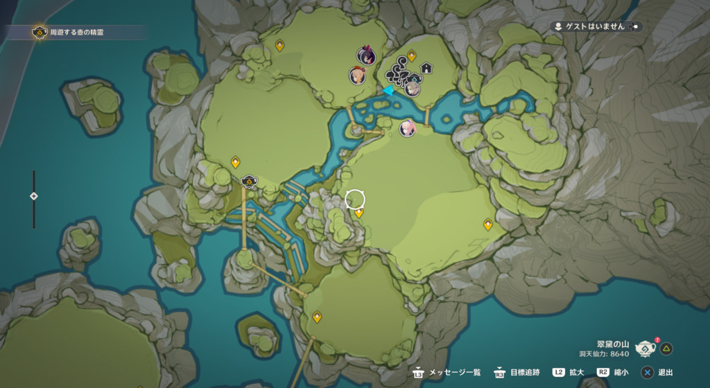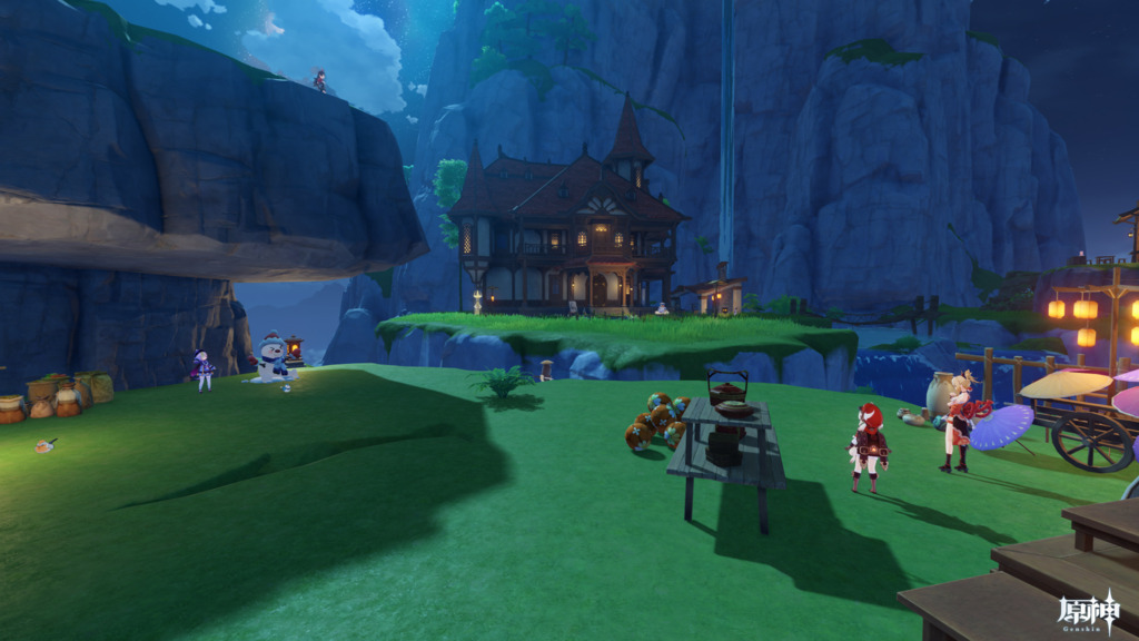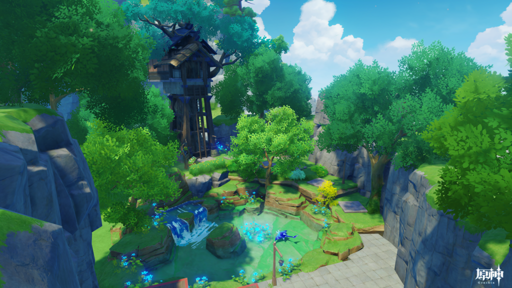 隣接しているエリアは「秋抱きの山(ランク7)」と「冬掃きの山(ランク9)」で、アンバー・七七・クレー・宵宮がいる側が「秋」、メイン建築・アルベド・心海がいる方が「冬」です(小川で隔てられてますが、ここは同エリア扱いで負荷制限も共有)。