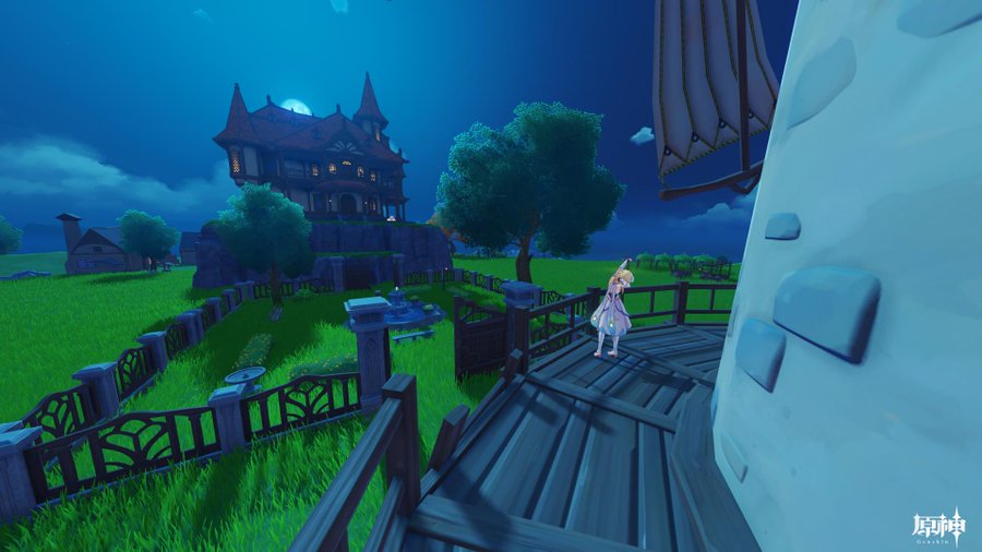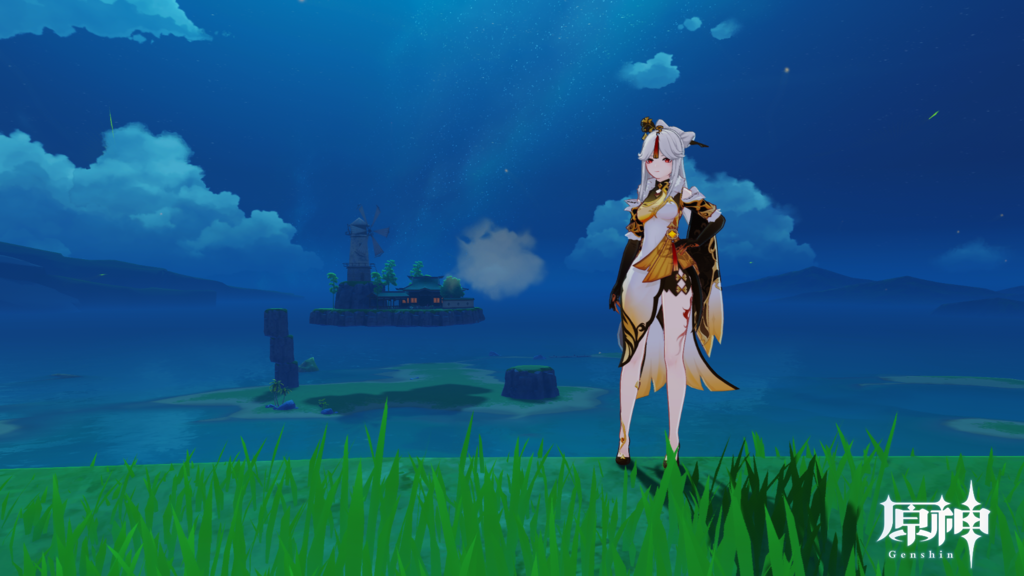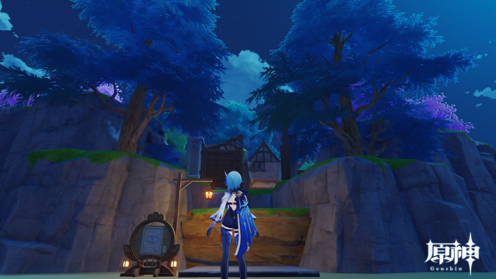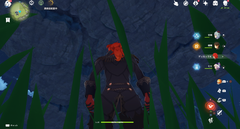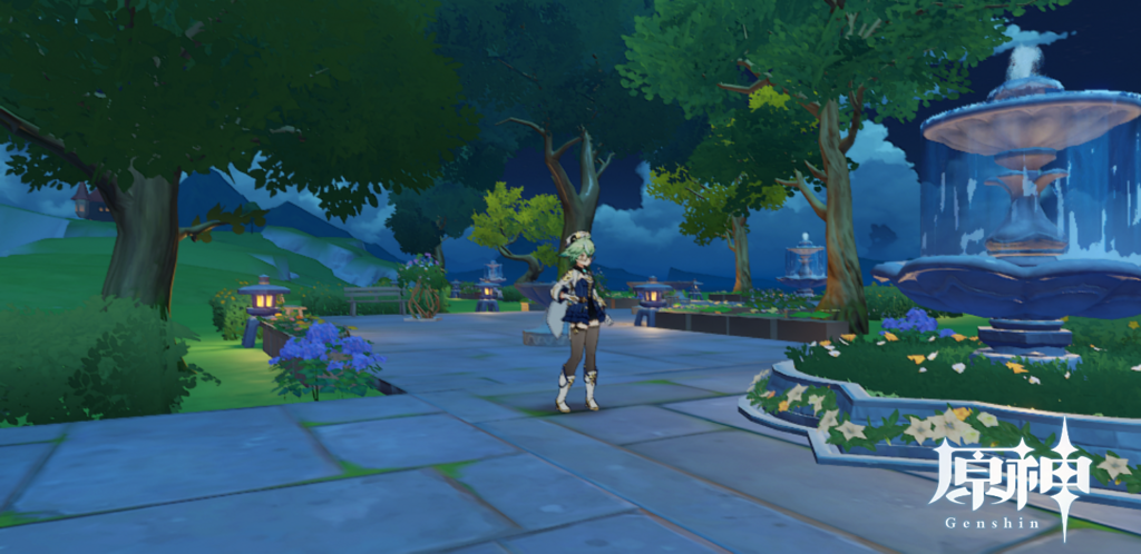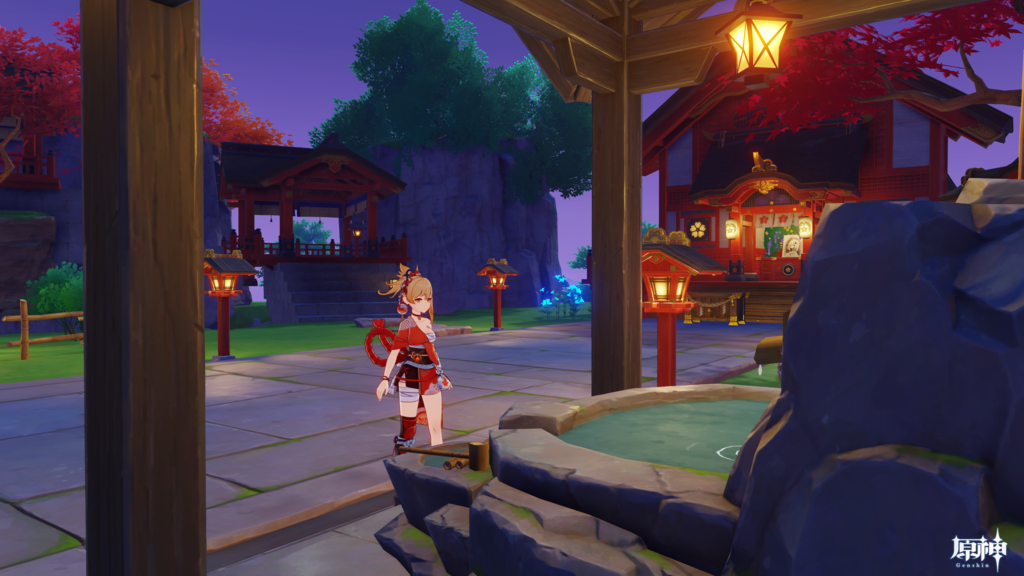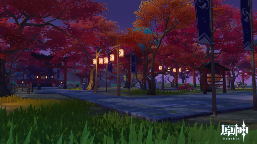 隣接しているエリアは「秋抱きの山(ランク7)」と「冬掃きの山(ランク9)」で、アンバー・七七・クレー・宵宮がいる側が「秋」、メイン建築・アルベド・心海がいる方が「冬」です(小川で隔てられてますが、ここは同エリア扱いで負荷制限も共有)。