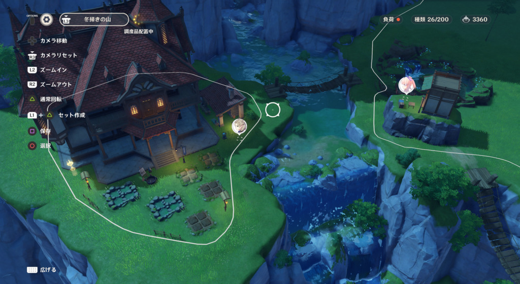 結果的に、メイン建築・鍛造・合成・田んぼ6つ・霊沼雲池・雪だるま・キャラ6名・ヤマガラ2羽・忍犬・その他照明や調度品等を、近い範囲内に並べることができた。