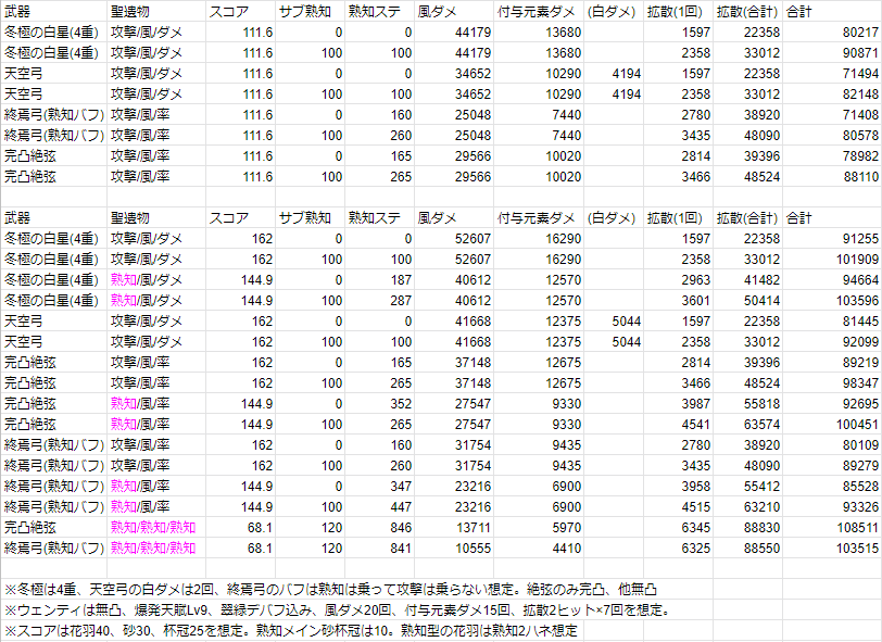 計算乙です。この表みてると 熟知/風/会心のハイブリッド型がバランスええな…と思いましたわ。もちろんサブステ厳選それなりにやらないと中途半端になりうるのはそうなんだけど…。