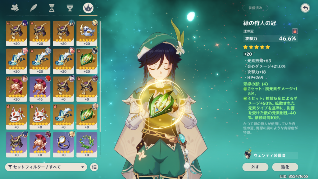 熟知掘りしてるときに出た会心or攻撃冠でサブOP強かったらそれに差し替えてるわね。スクロさゆのための厳選でウェンティ君が強化されていくわ