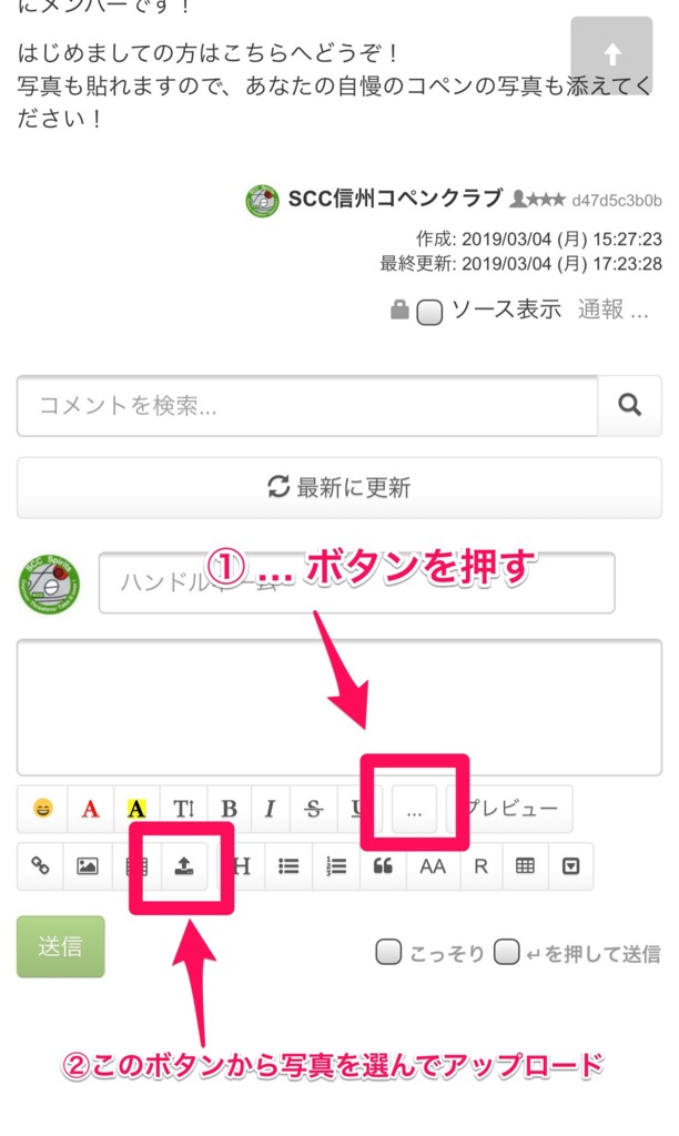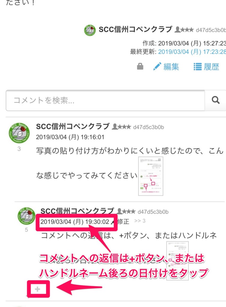 コメントへの返信は、+ボタン、またはハンドルネーム後ろの日付をタップして下さい