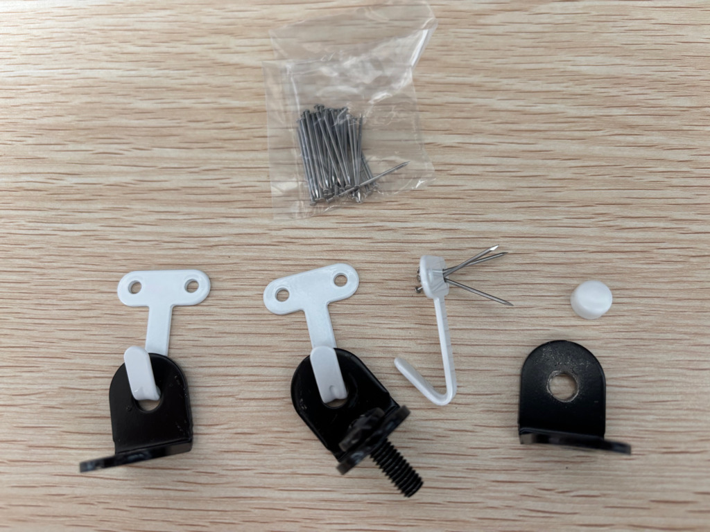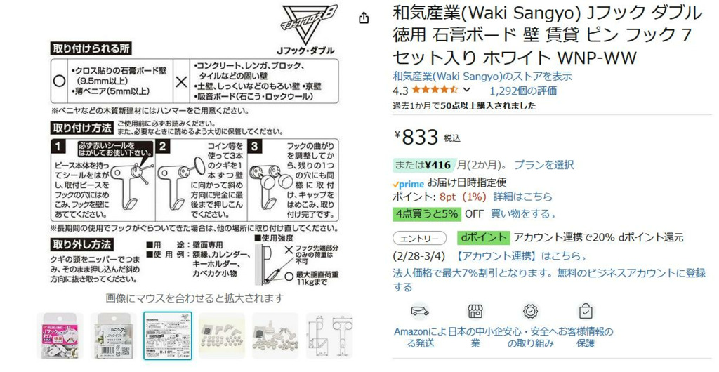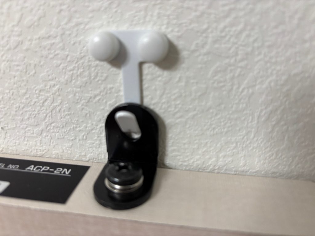 その後、レーザー墨出し器で位置決めして、石膏ボード用のフック (耐荷重 一個当たり 11Kg) 2個で壁に固定。