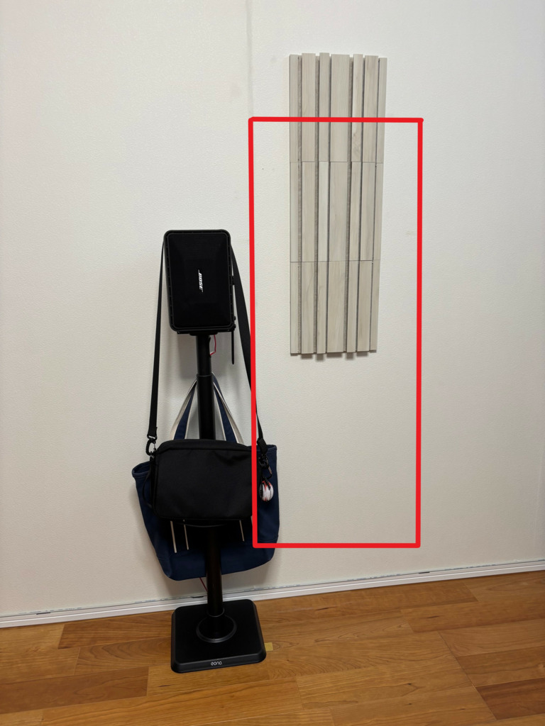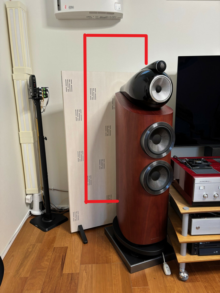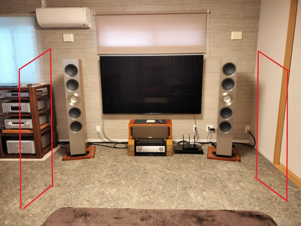 目的は一次反射面もヤマハパネルにして見栄えも向上と現在の物 (効果にやはり疑問有り 笑) の廃止、床置きを止めて4枚共壁掛けに。床置きは足が邪魔になっているので、壁掛けにしてスピーカーの真後ろにすれば効果的にも良いかな・・・赤枠内に設置予定。