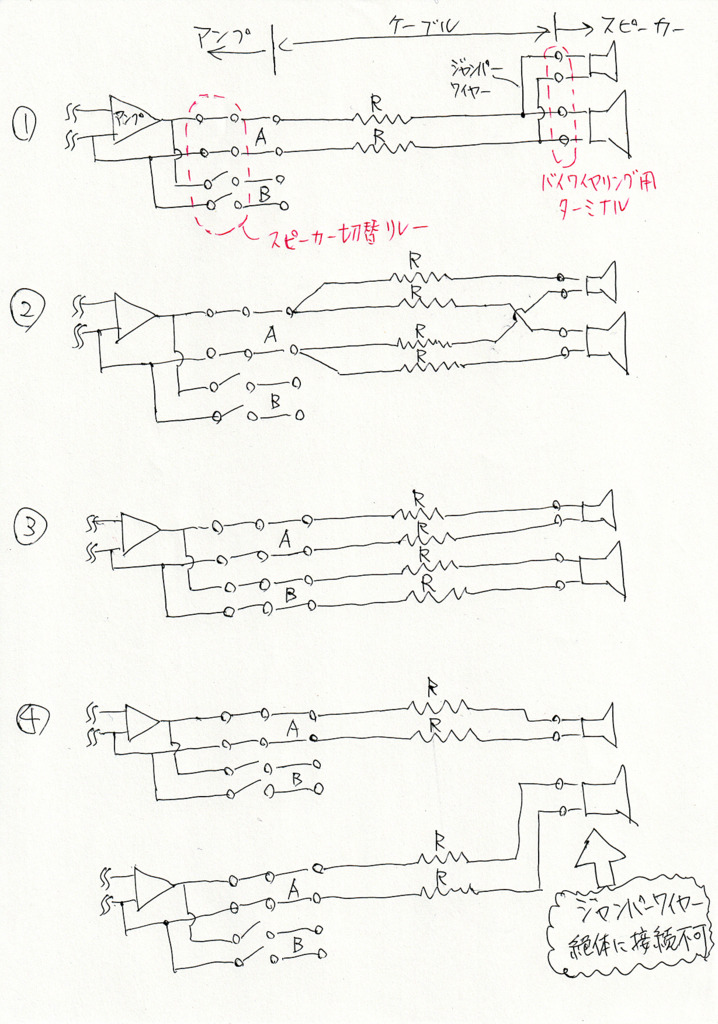 昨日は図1と図2は電気的に同じと書きましたが、写真では2.と3.は電気的に同じと言うことになります。厳密には3.ではスピーカー切替リレーを介して混じりあっていますがリレーの接点抵抗は無視できるほど小さなものです。なので2.と3.は電気的に同じです。
