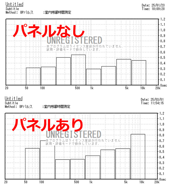 パネルなし時はすべての帯域でで0.3秒~0.5秒とオールドジャズを聴くには理想的な残響時間にセッティングできていたが、パネルを置くと低域と高域の残響時間が明らかに長くなります。
