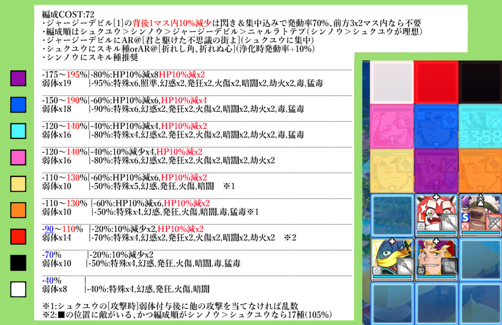 消防版の割合削りでギルドバフ使わず前2x3マス100%削り編成、攻撃順注意 自前所持ならCPギルドバフで開幕CS撃つ方が楽だと思います