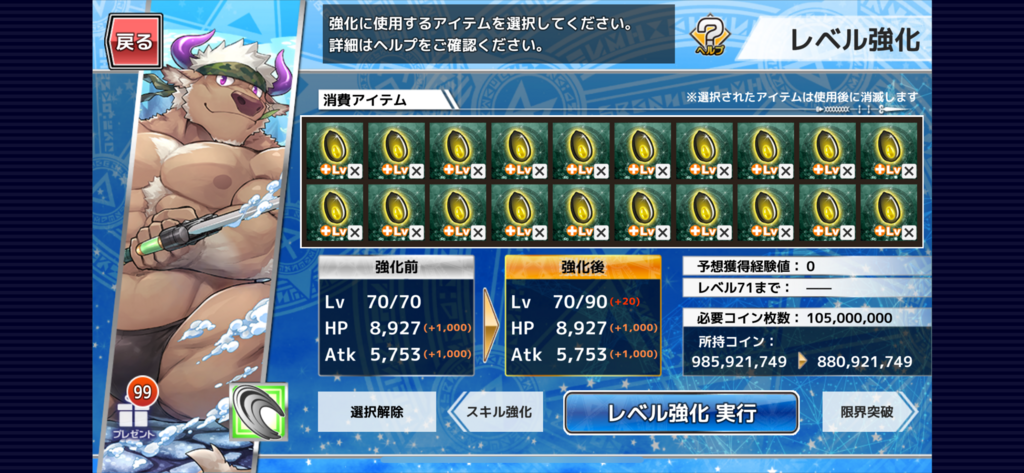 誰か一人Lv90に上げようとしたら、多分コインが溜まる前に他の強化素材カンストするまで全部揃っちまうと思うんだな。で、他の子に浮気してそっちにコイン使う、と。