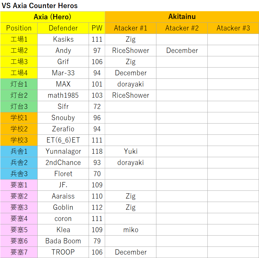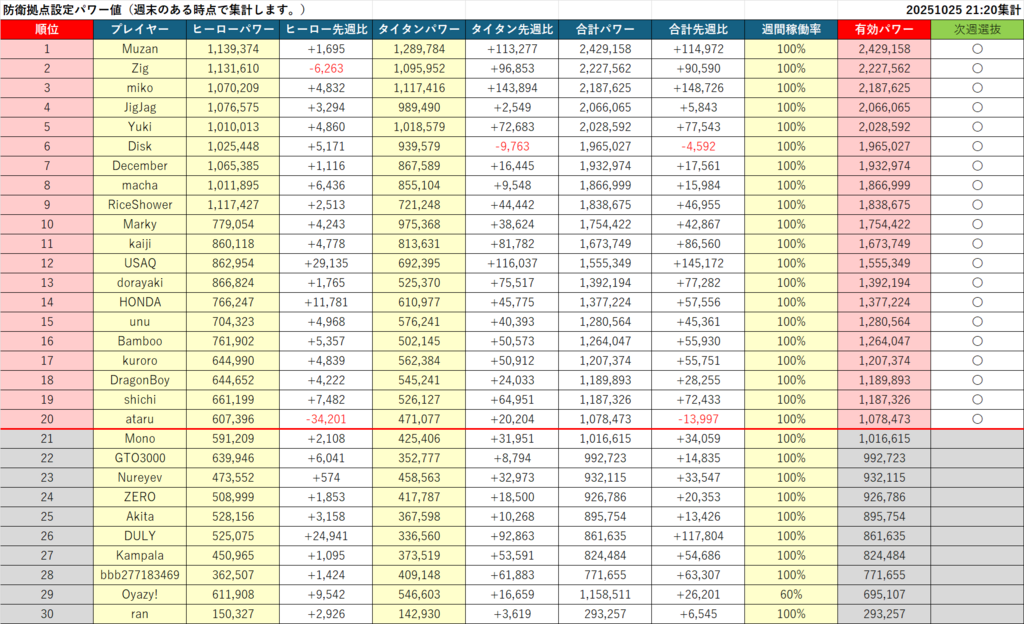 - 入れ替えは、週末のある時点で防衛登録されている「ヒーロー+タイタンの合計パワー」に「その週の稼働率」を乗じた有効パワーで並べなおし、上から20人で決定。このメンバーで次の一週間を戦う。