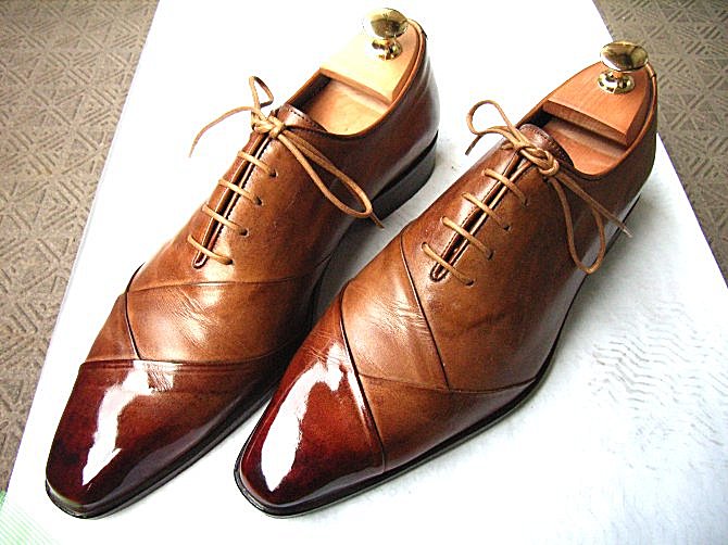 華やかなブラウンの革に控えめなパンチドキャップトゥのデザインのlazymanです。